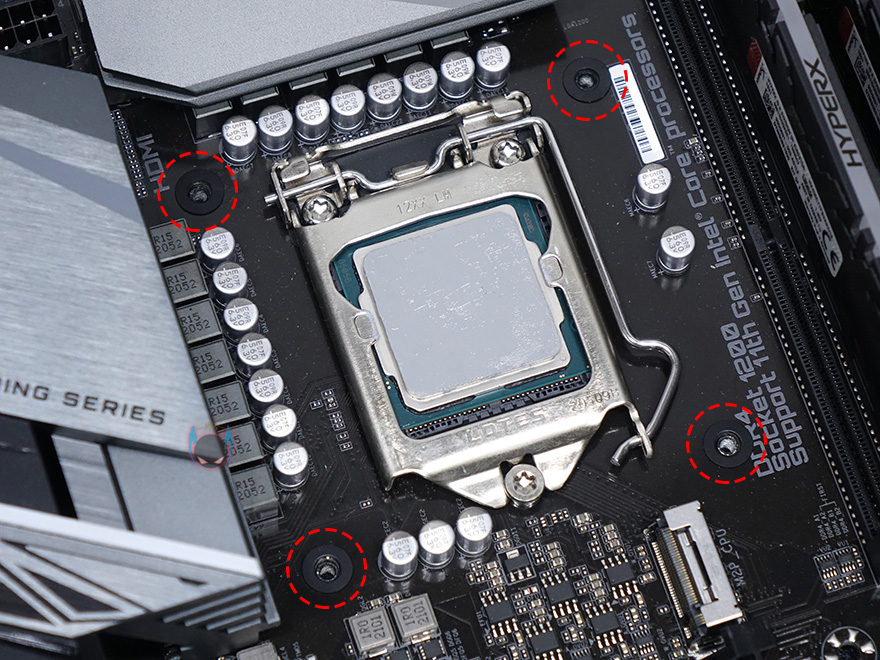 그럼, 직접 아틱 Liquid Freezer II 240 일체형 수냉쿨러를 사용해봐야겠죠. 앞서 언급했듯이 QR코드를 통해 아틱 홈페이지에서 제공하는 메뉴얼의 설치가이드를 참고하면 되는데, 일부 소비자에겐 조금 내용이 부족함 부분이 있습니다. 일단, 인텔 CPU 115X용 설치가이드 순서대로하면 먼저 와셔 스티커 중 4개를 메인보드 뒷면 쿨러-홀부분에 부착합니다. 그다음 백플레이트를 올려주고, 전면쪽에도 다시 쿨러-홀부분에 나머지 남은 4개의 와셔 스티커를 부착해줍니다. 그리고나서, 115X용 스탠드-오프를 결합해줍니다. 여기까지는 초보자분들도 설치가이드를 보고 쉽게 따라할 수 있습니다.