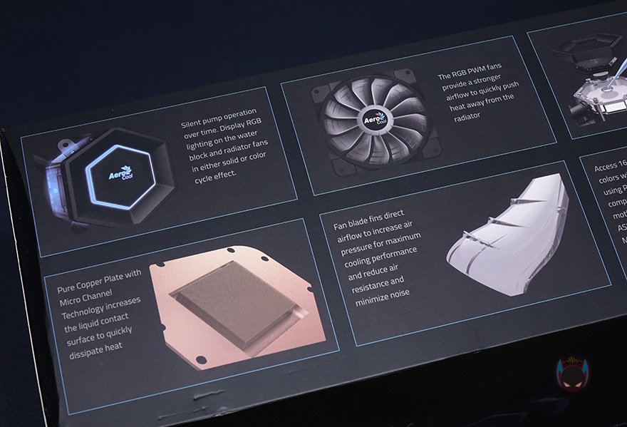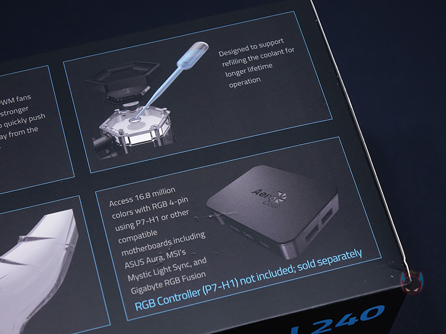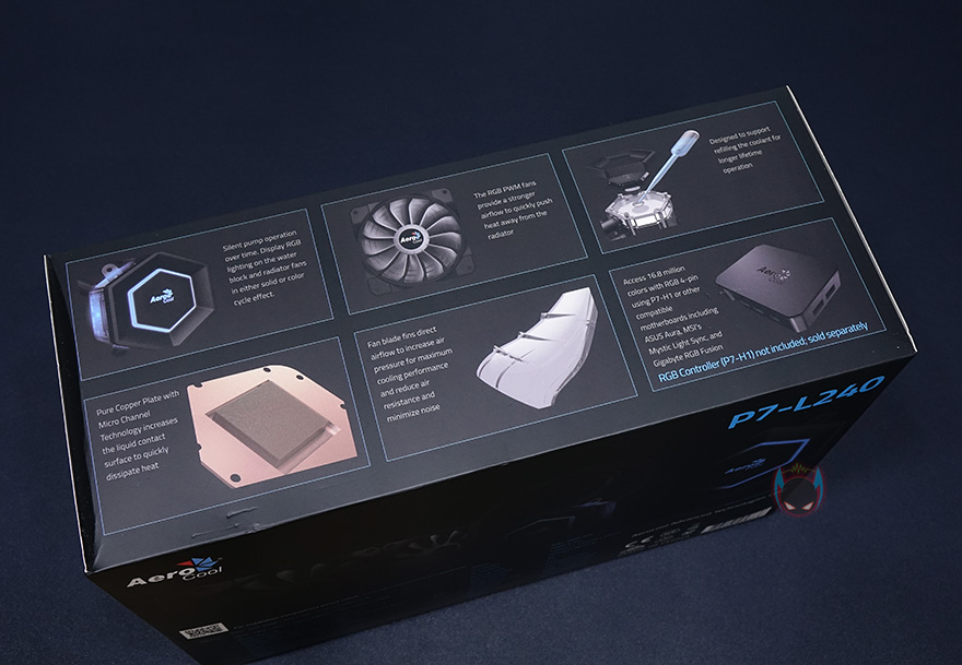 제품팩키지는 박스전체까지 비닐로 밀봉처리되어 있으며, 박스 전면에는 페이드-인 효과처럼 제품 이미지를 담고 있는데, 시작에서 언급한 프로젝트7이라는 표기도 함께 확인할 수 있죠. 박스측면에는 제품의 주요특징으로 워터블록, RGB 팬, 구리재질의 베이스, 팬 날개 디자인, 냉각수 교체, RGB 컨트롤 허브를 언급하고 있는데, RGB 컨트롤 허브를 포함되어 있지 않습니다. 이부분 뒤에서 다시 언급하죠.