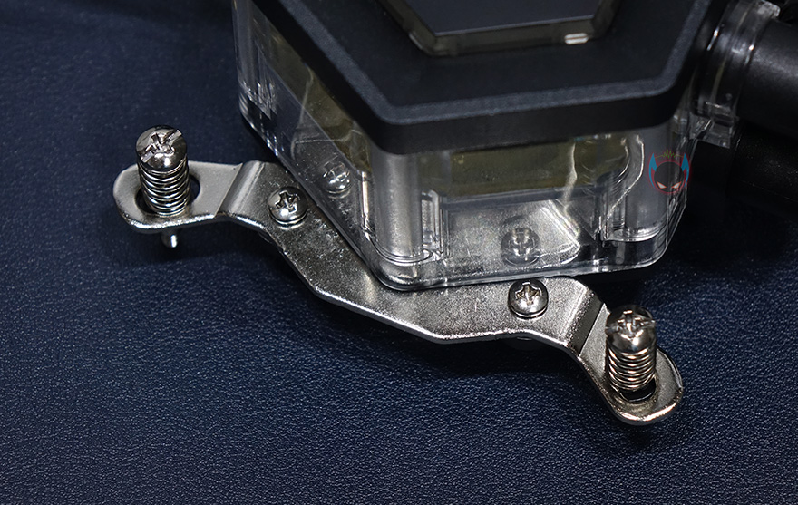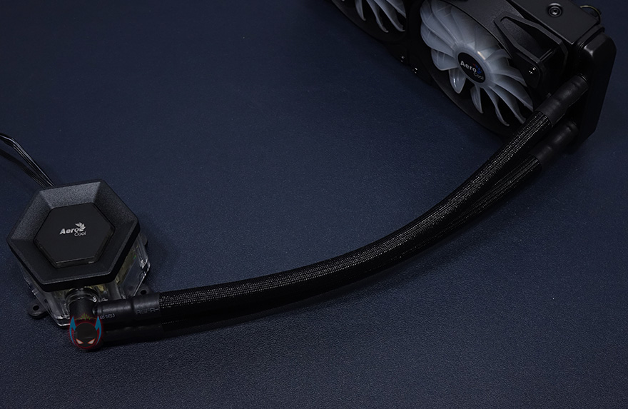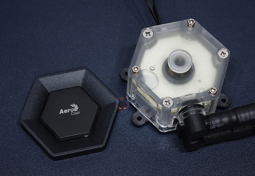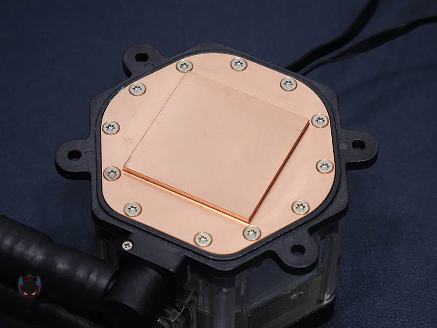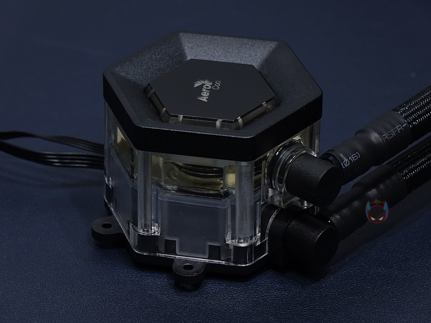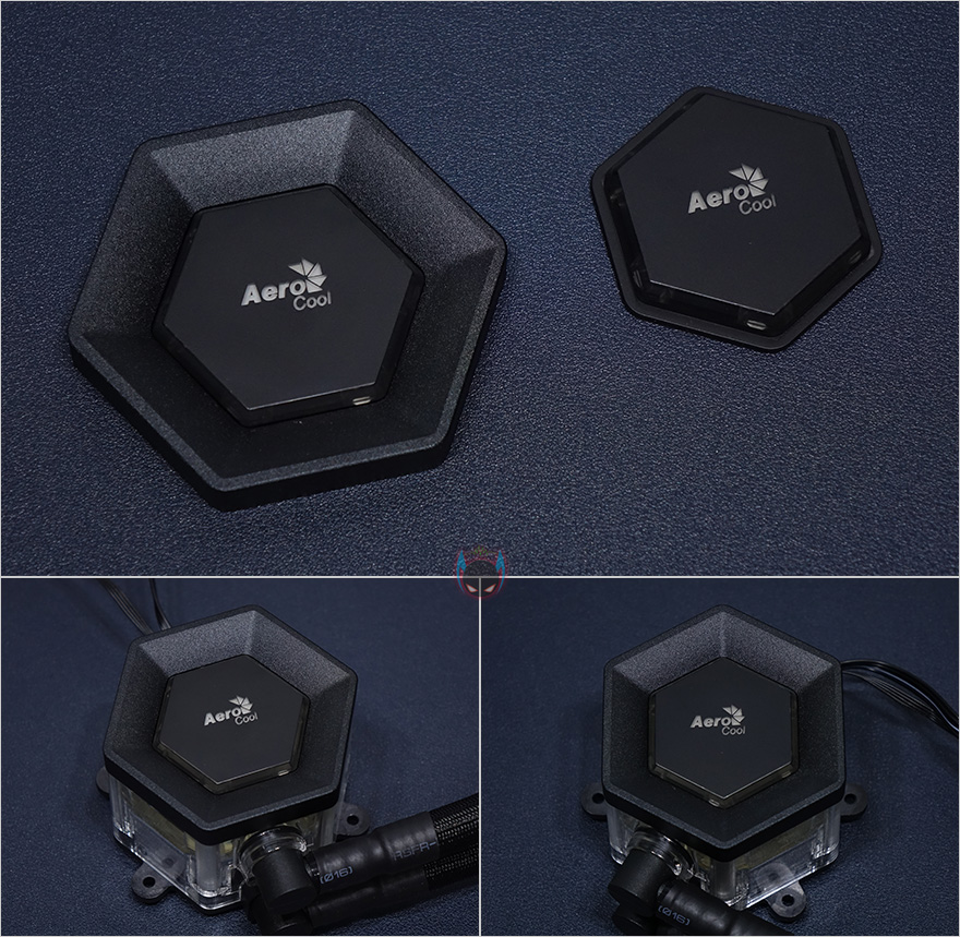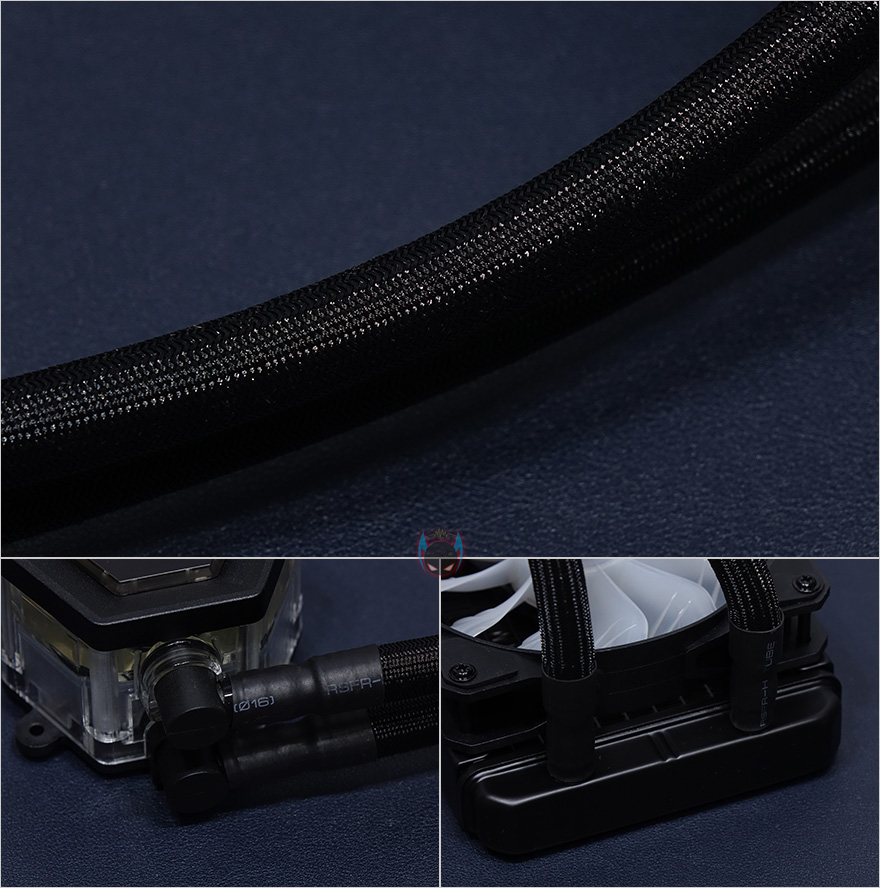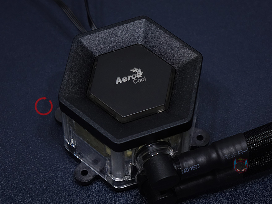 라디에이터와 워터블록을 연결하는 튜브는 전체 슬리빙 처리를 해놨으며, 길이는 mm 입니다. 그리고, 양쪽 모두 연결부에 누수방지를 위해 수축튜브까지 해서 마감처리를 해놨죠. 워터블록은 육각형 디자인으로 시계방향으로 돌리면 상판 패널부분을 쉽게 분리할 수 있습니다. 이렇게 상판 패널을 분리하면 앞서 구성품에서 본 추가교체용 로고패널로 교체할 수 있는거죠. 그리고, 분리된 상태에서 워터블록 상단 마개를 열어서, 역시 구성품에서 확인한 스포이드를 사용해 냉각수 교체도 할 수 있습니다. 워터블록의 펌프 역시 작동방식은 4핀(PWM) 방식이고, 12V RGB를 지원하고 있죠. 워터블록 측면이 투명 아크릴이기 때문에 RGB 효과가 극대화된다 할 수 있습니다. 그리고, CPU와 맞닿는 베이스부분은 구리재질로 매끄럽게 래핑처리가 되어있고, CPU 면적에 맞게 돌출형으로 되어 있죠.