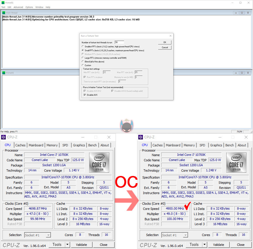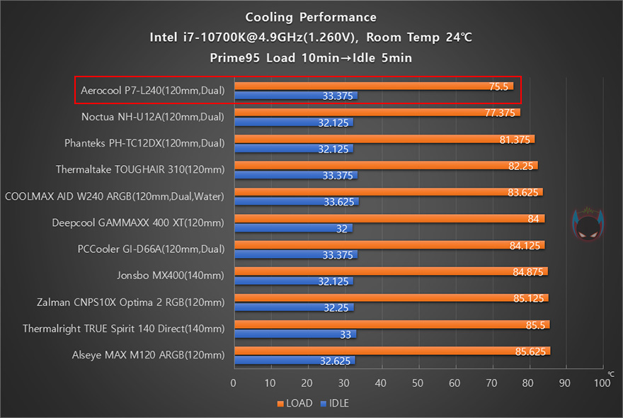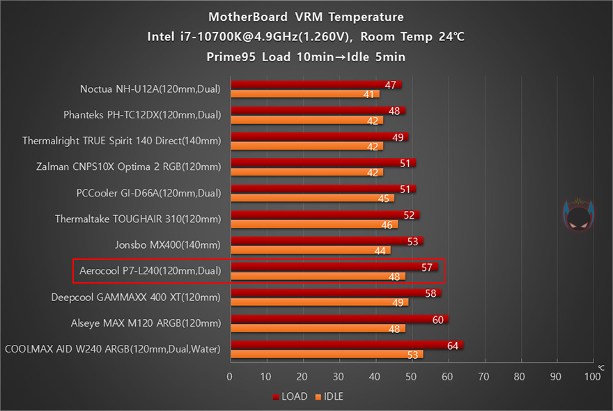 이제, 에어로쿨 P7-L240 일체형 수냉쿨러 냉각성능을 확인해보는데, 수냉쿨러이기때문에 바로 인텔 i7-10700K CPU를 4.9GHz까지 오버클럭으로 적용해, Prime95 프로그램으로 10분간 100% 과부하 Load, 이후 5분간 Idle로 돌아가는 진행을 했습니다. 먼저, CPU온도의 냉각성능 경우 수냉쿨러답게 공랭쿨러보다 확실히 성능이 좋다라는 것을 그대로 보여줍니다. 반면에 메인보드 전원부 온도 냉각성능 경우는 공랭쿨러보다 약한 모습을 보여주는데, 일반적인 수냉쿨러의 냉각성능 특징을 그대로 보여준다 할 수 있겠습니다. 저렴한 메인보드를 사용한다면 별도의 메인보드 전원부 쿨링을 갖춰야하고, 비싼 메인보드를 사용한다면 환경에 따라서 갖춰야 하겠습니다.