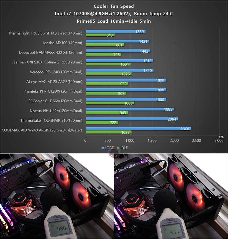 끝으로, 진행하는 동안 팬 속도와 워터블록&팬 소음 측정을 해봤는데, 팬 속도는 Load상황에선 약 1500RPM대로 팬 사양의 최대속도보다 300RPM정도 낮게 작동했으며, Idle 상황에선 약 1000RPM대로 작동했습니다. 메인보드의 PWM 자동방식으로 진행했기 때문에, 만약 팬의 최대 속도인 1800RPM대로 작동했다면 좀 더 나은 쿨링성능을 볼 수 있을것으로 생각되며, 소음은 Load에선 약 49dB(A), Idle에선 약 41dB(A)로 Load에선 소음이 다소 있지만, Idled에선 정숙한 편입니다. 실제로 PC케이스에 장착해서 사용한다면 이보다 소음은 좀 더 낮게 들립니다.