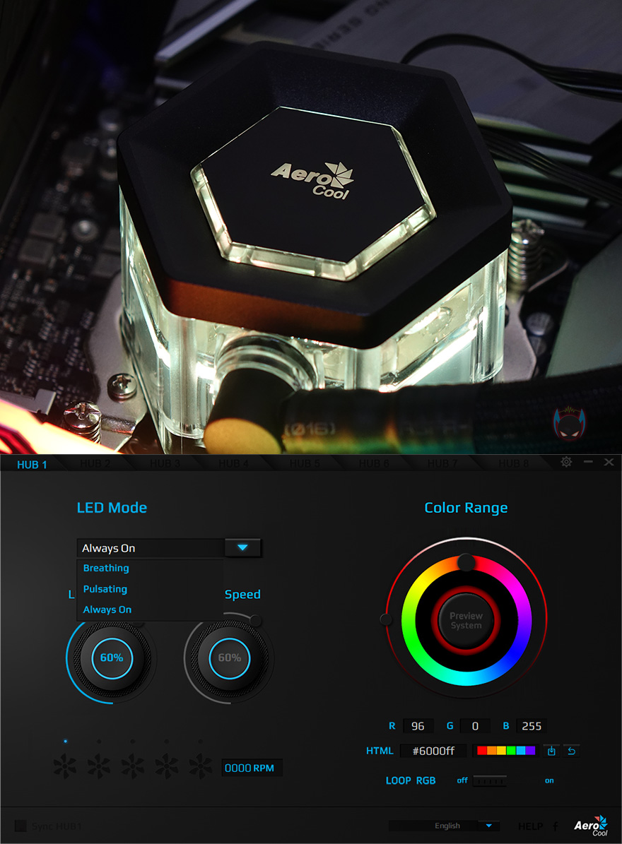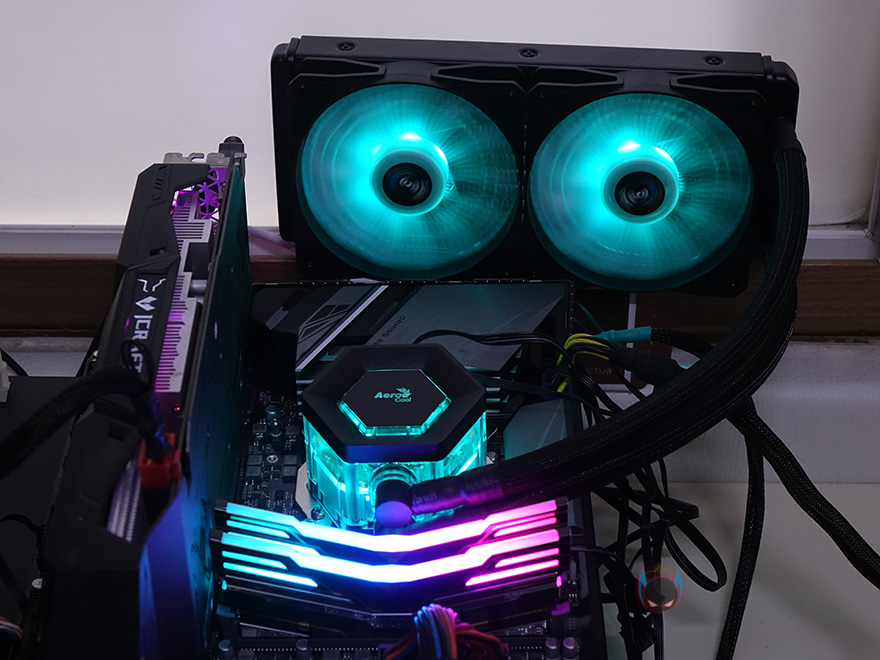 그럼, 본격적으로 에어로쿨 P7-L240 일체형 수냉쿨러의 성능을 확인해봐야겠죠. 그전에 장착 후 PC를 켜면 팬과 워터블록에서 RGB 효과를 바로 확인할 수 있으며, P7-H1 RGB 컨트롤 허브로 작동하기 때문에 Rev RGB Pro에서 확인했듯이 전용 소프트웨어로 컨트롤 할 수 있습니다. 조금 아쉬운 점이라면 Rev RGB Pro에서 언급했듯이 효과모드가 3가지 밖에 없다라는거죠. 그래도, 확실히 워터블록이 투명 아크릴로 되어있어서 라이팅효과가 예쁘다라는 느낌을 받습니다.