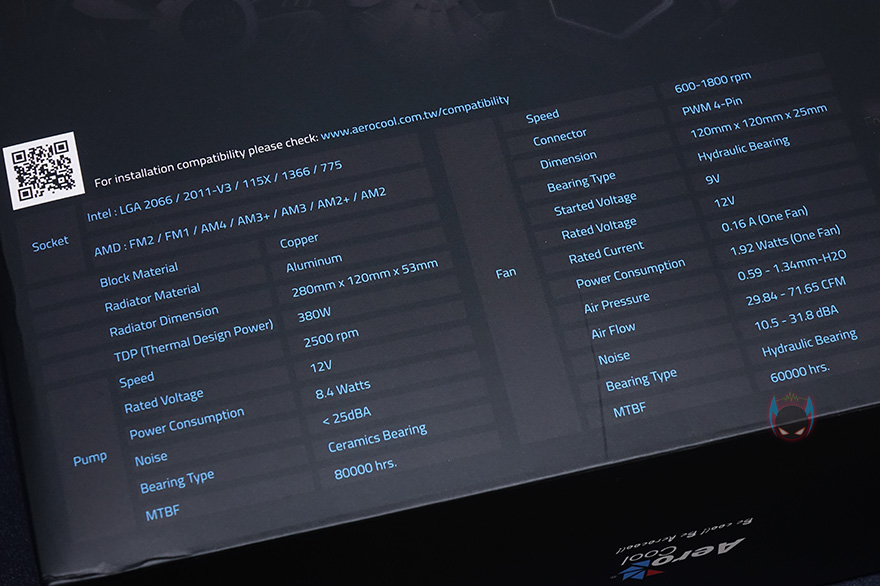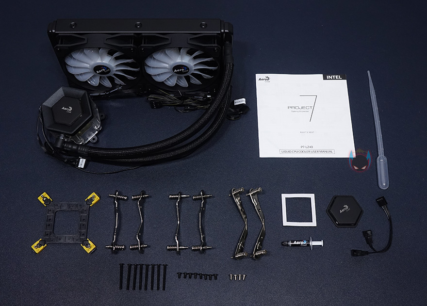 그리고, 박스후면에는 제품의 기본사양을 표기해놨는데, 소켓 지원부터 라디에이터, 펌프, 팬 사양까지 상세하게 표기해놨습니다. 박스를 열어보면, 속박스도 한 번 더 포장된 것을 확인할 수 있으며, 다른 일체형 수냉쿨러 제품들처럼 제품구성들은 비닐포장으로 되어있습니다. P7-L240 일체형 수냉쿨러를 비롯해 제품구성에는 제품설명서, 스포이드, 인텔용 백플레이트, 인텔용 115X와 2011 소켓 브라켓, AMD용 브라켓, 백플레이트 블록패드, 추가교체용 로고패널, 소량의 써멀컴파운드, Y자 팬 연장케이블, 부품 장착에 필요한 스크류들로 구성되어 있습니다.