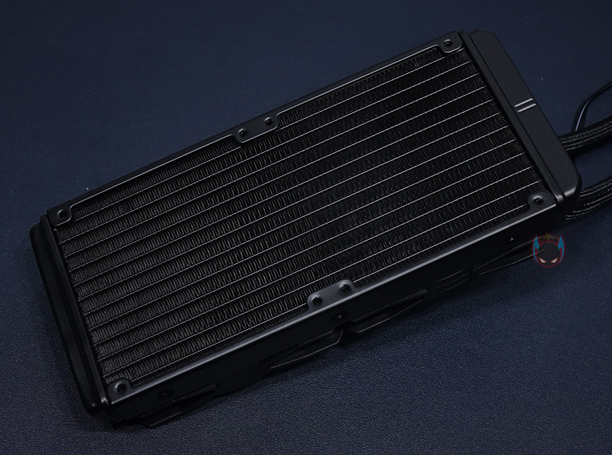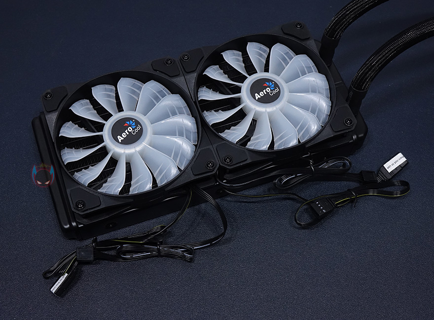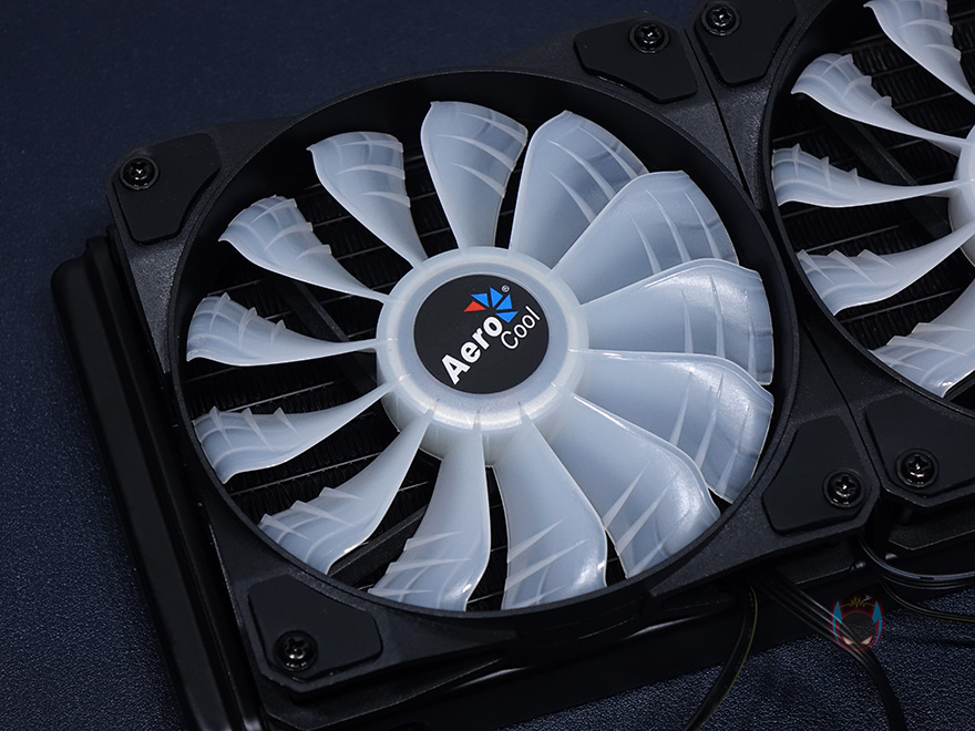 에어로쿨 P7-L240 일체형 수냉쿨러를 살펴보면, 라디에이터는 모델명에서 미리 알 수 있습니다. 120mm 팬을 2개 장착할 수 있는 240mm 라디에이터입니다. 그리고, 기본적으로 120mm 팬 2개가 라디에이터 한쪽면에 미리 장착되어 있죠. 일단, 미리 장착되어 있으면, 그만큼 장착하는데 시간단축이 되기때문에 소비자입장에선 편하죠. 팬은 총 13개의 블레이드(날개)를 가진 팬으로 날개마다 일명 샤크-핀이라 불리우리는 디자인을 적용했는데, 이런 디자인 모두 팬의 풍량을 높이기 위함이죠. 물론, 팬 연결방식은 4핀(PWM)방식이고, RGB 효과도 적용되어있는데, 12V 방식입니다. 또한, 암수핀 2가지 모두 갖추고 있죠.