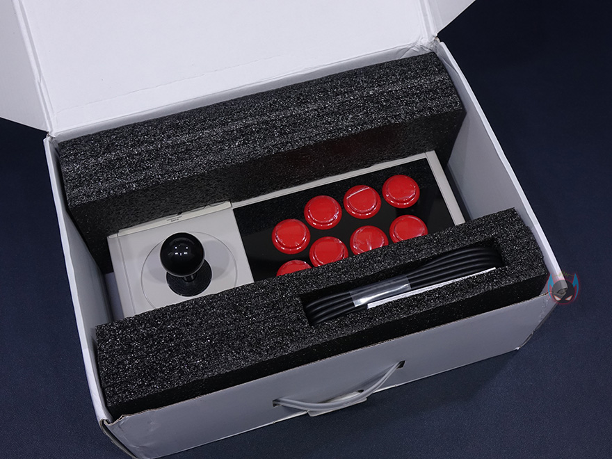 제품팩키지 형태는 박스형태로 무게감이 있기때문에 이동시 편의를 위한 손잡이도 처리되어있죠. 박스 전면에는 모델명과 함께 콘솔, PC, 스팀, 라즈베리 파이 등의 호환성 표시를 확인할 수 있고, 제품 이미지도 확인할 수 있죠. 제품 이미지만 봐도 색상으로 레트로 감성을 자극한다라는 것을 알 수 있습니다. 박스 후면에는 좀 더 자세하게 호환성 표시와 함께 제품의 부위별 명칭 및 기능을 표시해놔서, 개봉 전에 미리 기능을 알아볼 수 있겠으며, 박스를 열어보면 외부 충격방지를 위해 우레탄-폼으로 움직이지 않게 제품 포장이 된 것을 확인할 수 있습니다. 제품 구성은 간단하게 V3 Arcade Stick, USB 케이블, 제품설명서로 이루어져 있으며, USB 케이블은 Type C to A 인터페이스를 가졌습니다.