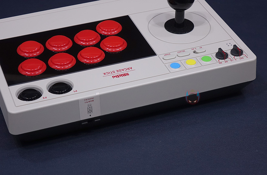 8Bitdo V3 Arcade Stick 제품 디자인부터 살펴보면, 앞서 잠깐 언급했지만 색상부터 레트로 감성을 자극합니다. 몸체 전체적으로 아이보리 색상 바탕으로 레버와 버튼들은 검빨(검정+빨강)조합으로 처리되어있죠. 여기에 레버 위치의 윗부분자리에는 요즘 시대에 맞춰 모드 스위치, 컨트롤 스위치, 페어링/터보/홈 버튼, 블루투스&2.4GHz 스위치, 선택, 시작 버튼이 배치 적용되어 있습니다. 컨트롤 버튼은 총 8개이며, 플레이버튼도 적용되어 있으며, 레버는 볼 형태입니다. 참고로 무게는 약 2kg로 묵직하죠.