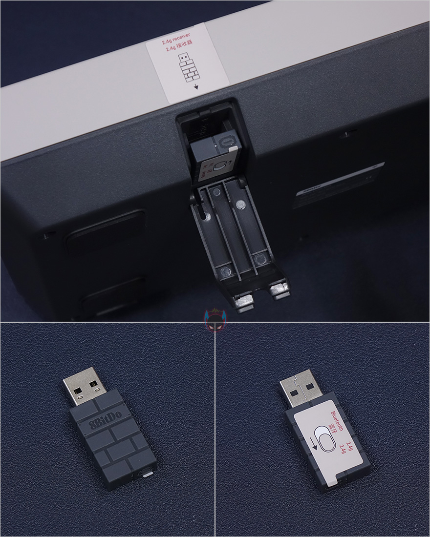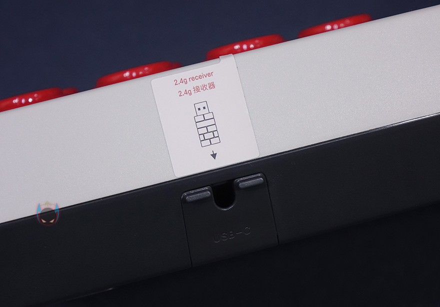 블루투스와 2.4GHz 2가지 무선 방식을 모두 지원한다고 했는데, 2.4GHz 연결시 필요한 일명 동글이라 불리우는 수신기는 분실이 되지 않게 별도의 수납공간이 있습니다. 바로, 전면에 배치되어있죠. 물론, 안쪽에는 유선 연결시 사용하라고 제공해주는 USB 케이블과 연결되는 USB 타입C포트도 적용되어 있죠. 2.4GHz 연결은 다른 제품들처럼 동글이 수신기를 연결할 기기의 USB포트에 꽂고, 레버 위에 배치한 블루투스&2.4GHz 스위치를 2.4GHz로 선택하면 바로 연결이 됩니다. 그리고, 무게감과 함께 미끄럼방지가 되도록 밑바닥부분에 패드도 부착되어 있죠.