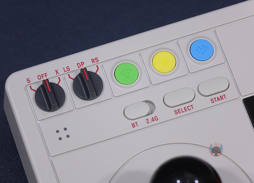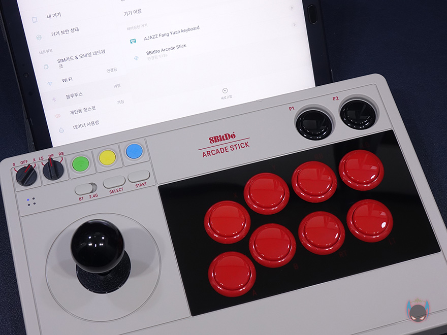 직접 8Bitdo V3 Arcade Stick 을 사용해보면, 모드 스위치를 닌텐도 스위치(S)로 할지 PC용(X)으로 사용할지 선택하면 자동으로 전원이 켜집니다. 그리고, 아래에 LED 인디케이터를 통해 배터리 상태도 확인할 수 있죠. 모드 선택과 함께 전원이 켜지면, 컨트롤 버튼에도 LED로 버튼 표시가 나오는데, 모드에 따라 버튼 표시가 다릅니다. 물론, 실제적인 컨트롤 버튼설정은 게임내에서 다시 설정할 수 있죠. 그리고, 동글이 방식의 2.4GHz 외에도 블루투스 연결방식도 가능한데, 연결방식은 다른 제품들처럼 페어링 방식이라 어렵지 않습니다.