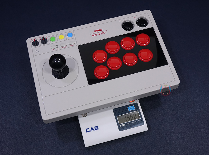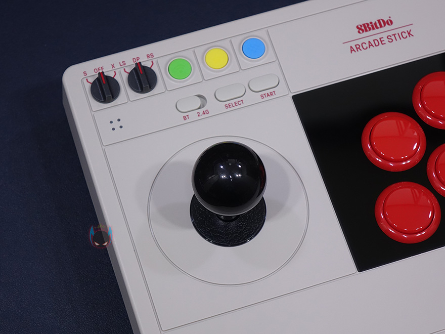 8Bitdo V3 Arcade Stick 제품 디자인부터 살펴보면, 앞서 잠깐 언급했지만 색상부터 레트로 감성을 자극합니다. 몸체 전체적으로 아이보리 색상 바탕으로 레버와 버튼들은 검빨(검정+빨강)조합으로 처리되어있죠. 여기에 레버 위치의 윗부분자리에는 요즘 시대에 맞춰 모드 스위치, 컨트롤 스위치, 페어링/터보/홈 버튼, 블루투스&2.4GHz 스위치, 선택, 시작 버튼이 배치 적용되어 있습니다. 컨트롤 버튼은 총 8개이며, 플레이버튼도 적용되어 있으며, 레버는 볼 형태입니다. 참고로 무게는 약 2kg로 묵직하죠.