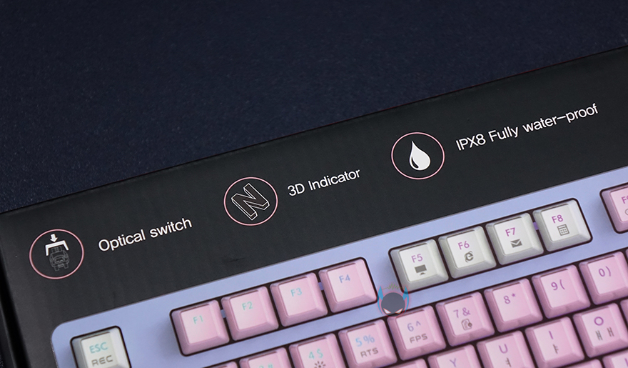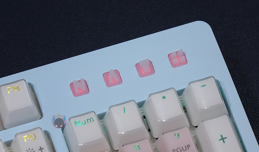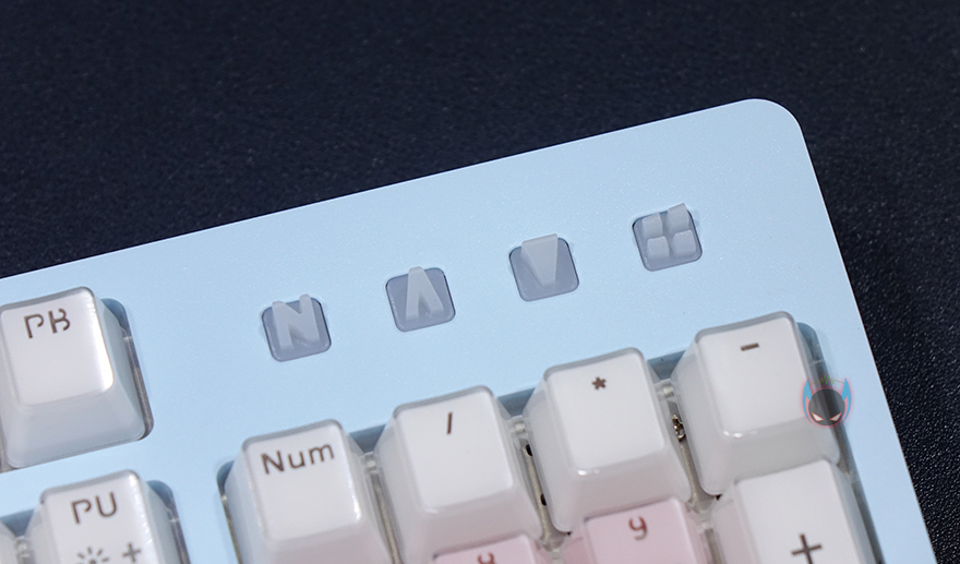 마이크로닉스 마닉 EX580 광축 크리스탈 게이밍 키보드를 살펴보면, 104키의 전형적인 풀-배열 키보드로 디자인부분에서 역시 가장 먼저 눈에 들어오는 부분은 색상으로 화이트를 제외한 블루와 핑크색상이 파스텔 색감으로 파스텔색감만이 주는 따뜻한 느낌을 잘 표현했습니다. 그리고, 방향키 위에는 마이크로닉스 로고를 표시해놨으며, 숫자키패드 위에는 LED 인디케이터가 적용되어 있는데, 기존의 일반적인 단순히 LED 표시만 보여주는 평면적인 처리가 아닌 입체적으료 표현된 3D 인디케이터를 적용하고 있습니다. 이렇게 입체적으로 표현되어있으면 아무래도 좀 더 쉽게 빨리 구분을 할 수 있죠.