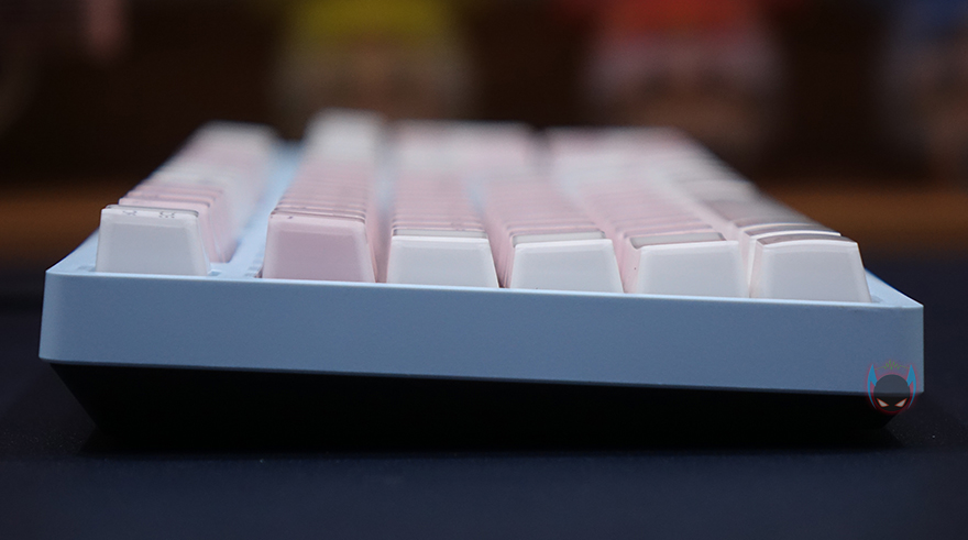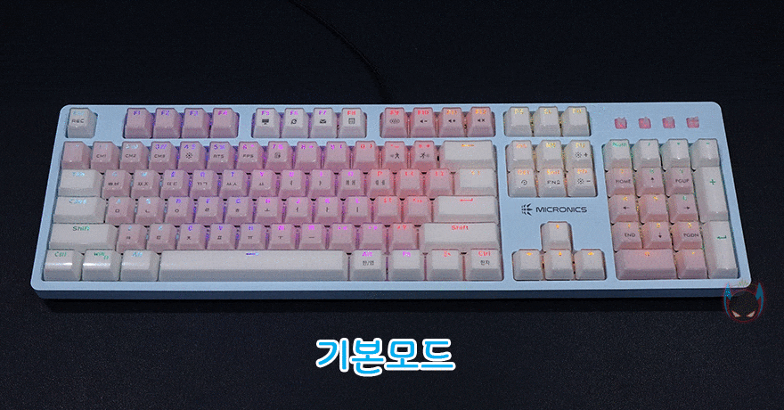그리고, 키-캡 역시 이 제품의 주요 특징이라 할 수 있는데, 바로 크리스탈 키-캡으로 안쪽에는 색상을 바깥쪽에는 투명함으로 이중 사출방식의 키-캡입니다. 사실 크리스탈 키-캡은 이전부터 마이크로닉스의 다른 키보드 제품에서도 적용되고 있죠. 실제로 빛이 없는 곳에서 보면 코팅한 느낌을 주고, 빛이 있으면 말그대로 크리스탈 느낌을 주는 것이 이 키-캡의 특징이라 할 수 있습니다. 이중사출 방식이라 두께(약1.6mm)도 좀 있죠. 그리고, 스위치는 마닉 4세대 광축으로 1~3세대를 거치면서 개선된 가장 최신 마이크로닉스의 광축으로 1억회 클릭수명, 키 입력속도 향상, 방진력 향상의 택타일 타입입니다. 또한, 스페이스-바 같은 긴 키들의 스테빌라이저는 체리식으로 적용하고 있습니다.