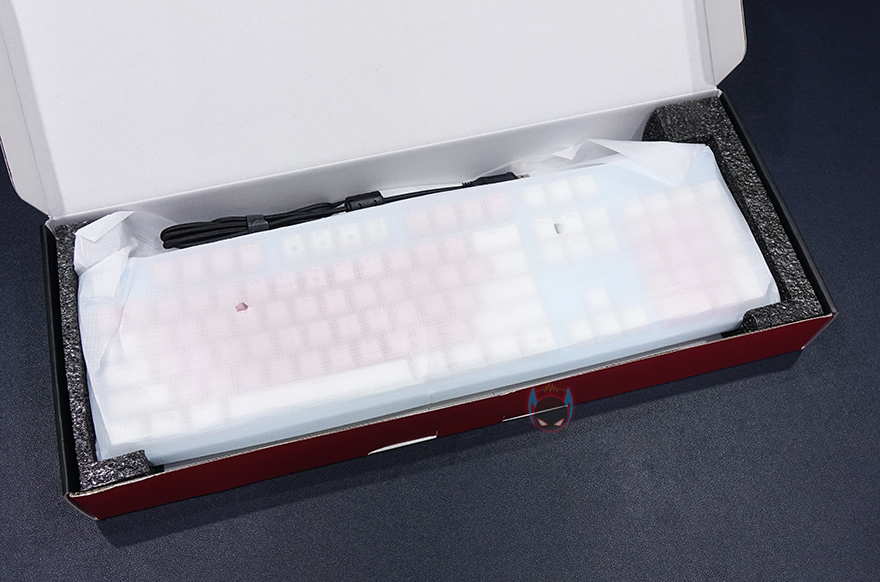 박스를 열어보면, 다른 키보드 제품들처럼 흔들리지 않게 그리고 외부충격방지를 위해 키보드 양쪽에 우레탄-폼 자재를 사용하면서 키보드도 별도의 포장재로 포장이 되어있으며, 제품구성은 간단하게 마닉 EX580 광축 크리스탈 게이밍 키보드, 제품설명서 및 보증서, 키-캡 리무버로 이루어져 있습니다.
