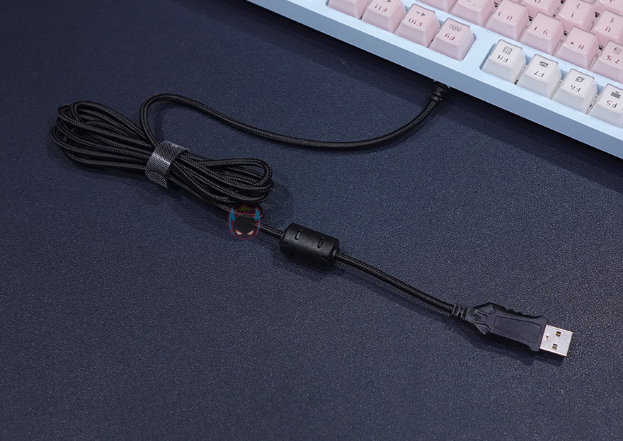 키보드 측면에서 보면 타이핑의 최적화라 불리우는 스텝-스컬처2 단계 배열을 갖추고 있으며, 키보드 밑바닥부분에는 미끄럼방지 고무패드부착과 양쪽 앞부분에 높낮이 받침대가 적용된 것을 확인할 수 있으며, 끝으로, 케이블은 총 1.5m 길이에 꼬임방지를 위해 직조케이블을 사용했으며, 신호손실 최소화를 위해 노이즈 필터도 적용되어 있죠. 연결 인터페이스방식은 USB방식입니다.