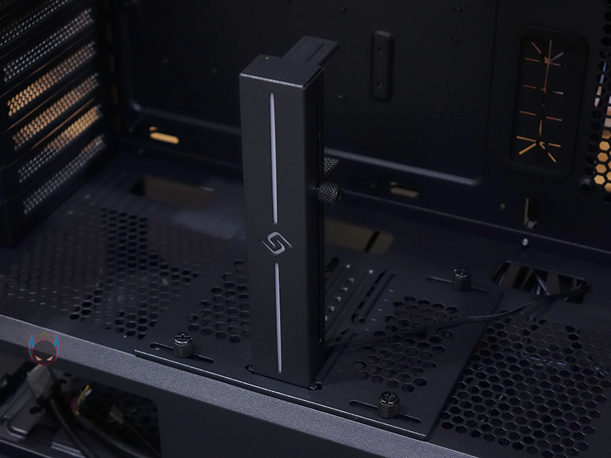 이제, 앱코 슈트마스터 P2000 퍼포먼스 PC케이스의 내부를 살펴보는데, 내부에서 가장 먼저 눈에 띄는 부분은 VGA(그래픽카드) 지지대입니다. 최근에 고급형 PC케이스에서 이런 VGA 지지대를 기본제공하는 경우가 점점 늘어나고 있죠. P2000 퍼포먼스에 기본제공되는 VGA 지지대는 고정하고 있는 핸드스크류를 풀면 쉽게 분리할 수 있는데, 지지대 안쪽에 핸드스크류를 풀면 앞뒤로 위치조절이 가능합니다. 그리고, VGA카드를 받쳐주는 받침대 역시 측면에 핸드스크류를 풀어서 위아래로 위치조절할 수 있습니다. 물론, 간격조절도 가능하죠.