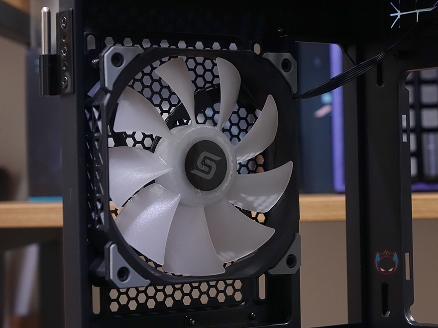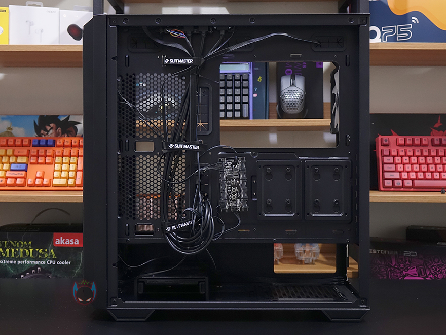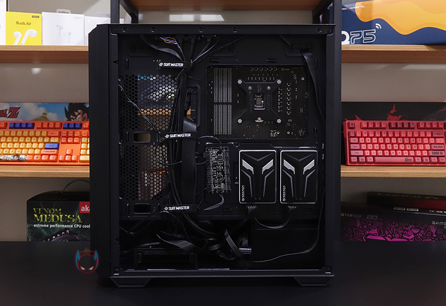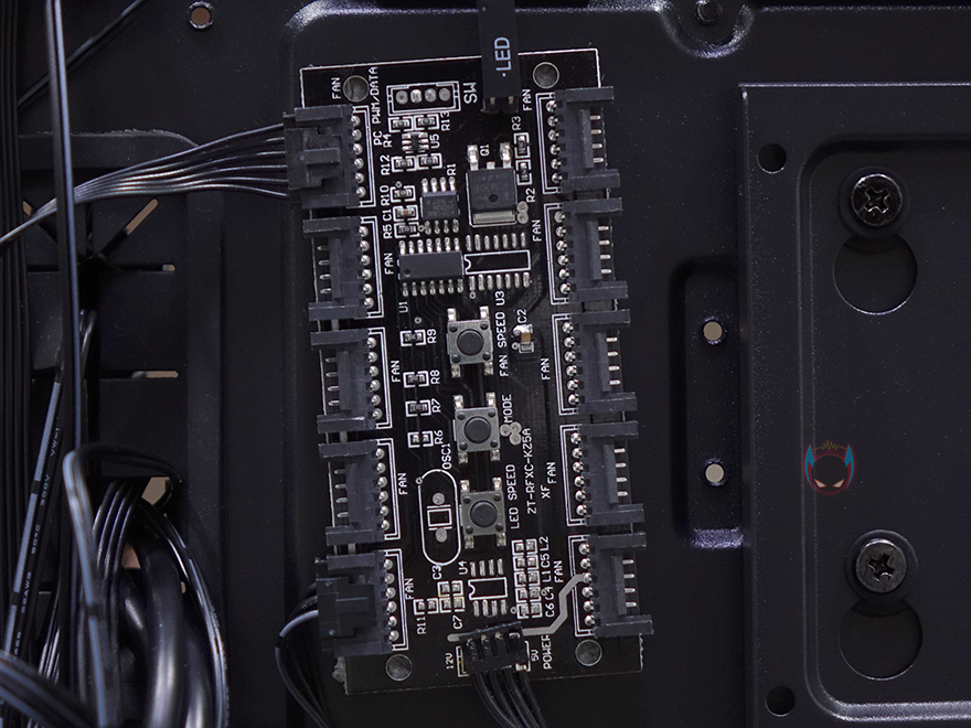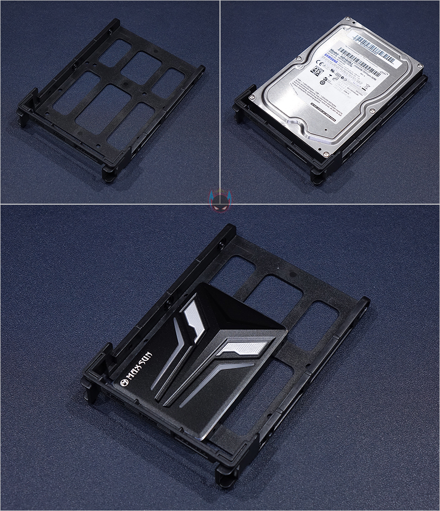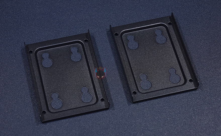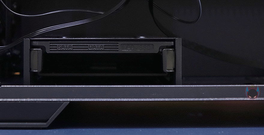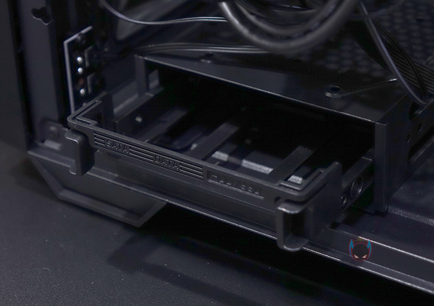 메인보드 트레이 후면에는 CPU-컷-아웃 바로 아랫부분에 RGB 컨트롤 허브와 2.5인치 저장장치 브라켓 2개가 장착되어 있는데, RGB 컨트롤 허브 중앙부분에는 3개의 버튼이 적용되어 있는데, 모드전환/모드속도/팬속도 조절을 할 수 있는 버튼입니다. 조금 아쉬운 점이라면 팬 연결 커넥터가 6핀 방식이기때문에 일반적인 4핀(PWM) 방식보다 팬 호환성에 제한이 있을 수 있습니다. 6핀보다는 4핀 팬들이 기본적으로 판매시장에 더 많으니깐요. 물론, 예전에 비해서 6핀 팬 제품들도 많이 늘어난 상황입니다. 그리고, 2.5인치 저장장치 브라켓은 위로 올리면 쉽게 분리가 가능하고, SSD/HDD를 최대 2개까지 장착할 수 있죠.