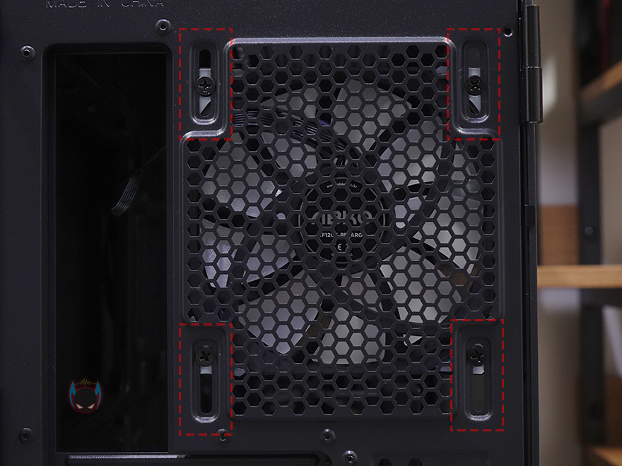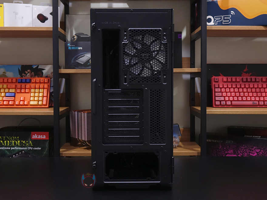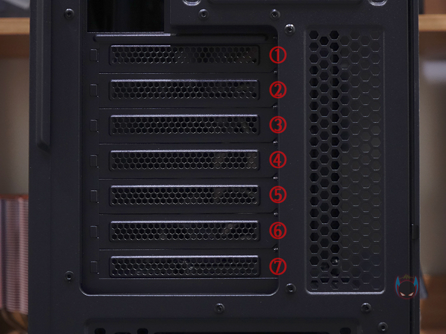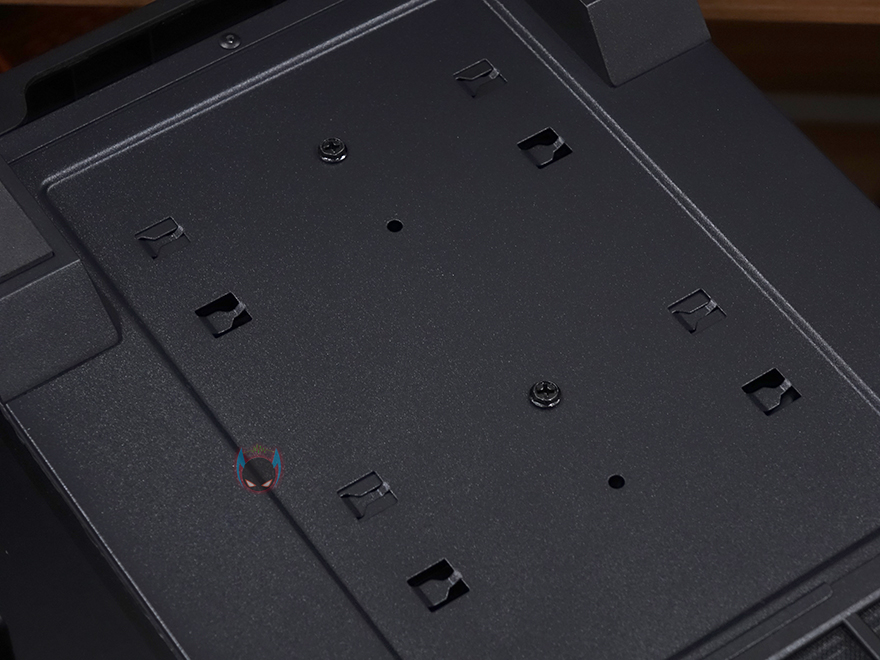 케이스 후면에는 후면 배기역할을 위해 에어홀 처리와 함께 내부에 120mm 팬이 기본 장착된 것을 확인할 수 있으며, 팬 상하위치조절이 자유롭도록 긴 나사홀로 처리를 해놨습니다. PCI슬롯은 미들타워 기준인 7개를 갖추고 있으며, 맨 아래 파워서플라이 자리에는 상하방향 모두 장착이 가능하게 나사홀이 적용되어 있죠. 끝으로, 케이스 외부 밑바닥부분에는 파워서플라이 자리에 분리형 먼지 필터가 적용되어 있으며, 앞부분에는 내부에서 확인하겠지만, 내부 3.5인치 HDD베이 고정나사와 함께 위치이동이 가능하도록 해놨으며, 케이스 받침대에는 고무패드부착과 함께 약 20mm 높이를 가지고 있습니다.