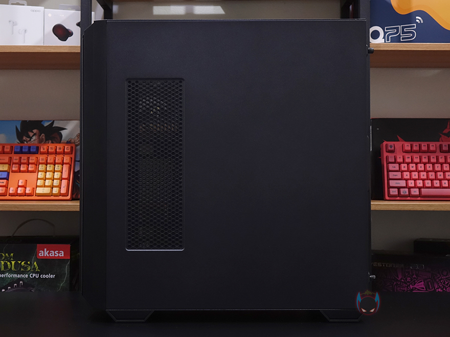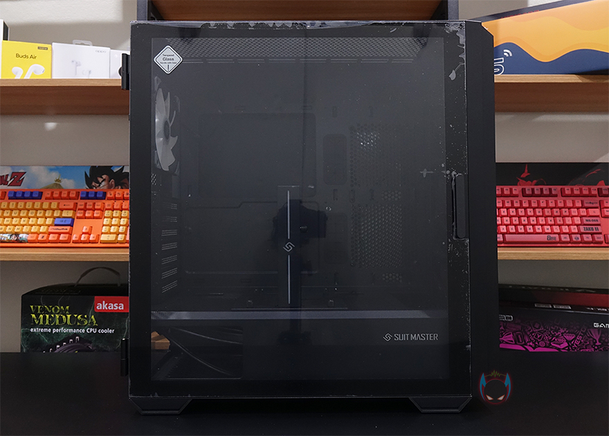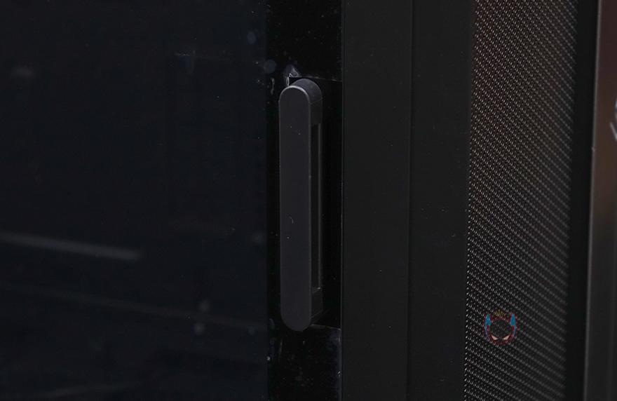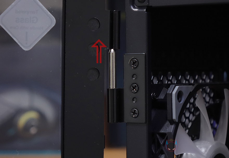 P2000 퍼포먼스 PC케이스의 사이드패널은 전면에서 봤을 때 오른쪽 패널은 샤시 패널로 앞부분에 내부 추가 쿨링효과를 볼 수 있게 에어홀 처리를 해놨으며, 왼쪽 패널은 강화유리를 적용하고 있습니다. 당연히 강화유리 패널에는 개봉시 기본 비닐이 부착되어 있는데, 비교적 기포없이 깨끗하게 부착되어 있어서, 굳이 바로 제거할 필요는 없겠습니다. 왜냐하면 여전히 강화유리 PC케이스 제품들이 강화유리 파편방지를 위한 비산필름을 기본 부착해서 출시하고 있지 않으니깐요. 물론, 포장시 보호비닐 제거는 사용자의 선택 몫입니다. 그리고, 강화유리 패널은 앞부분에 손잡이를 적용해서 도어방식으로 열리고, 힌지부분도 분리가 가능해, 강화유리는 따로 분리할 수 있죠.