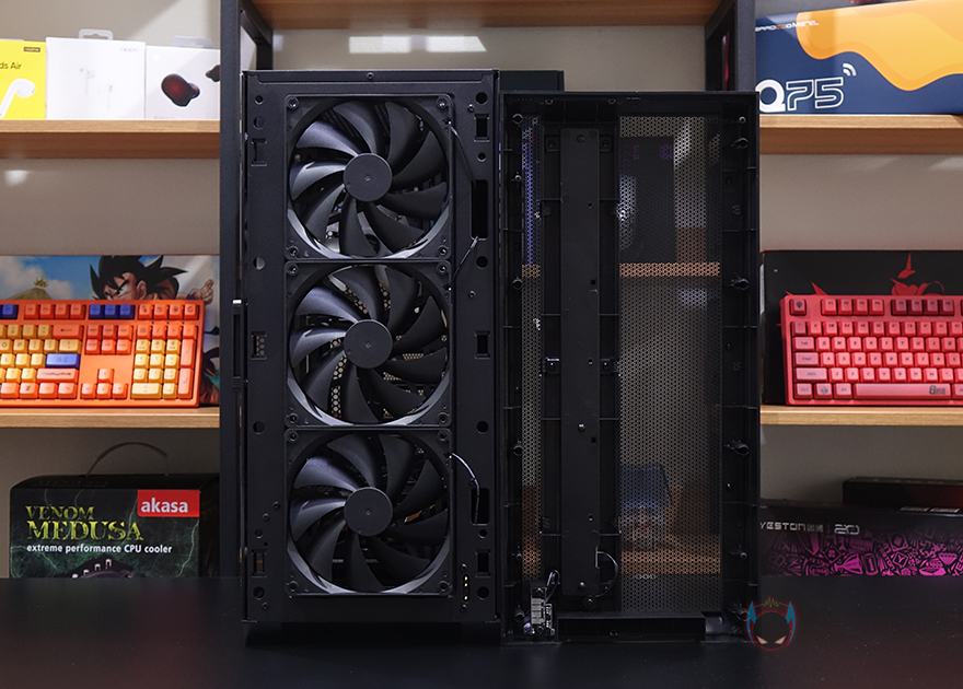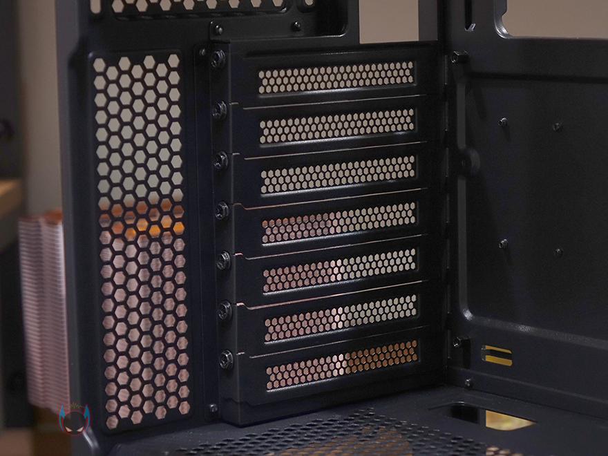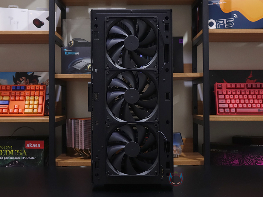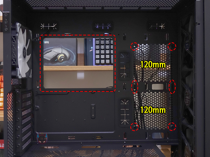 그리고, VGA 지지대를 만약 사용할 필요가 없다면, 내부 하단 커버 상단에 에어홀 처리와 함께 120mm 간격으로 나사홀이 있어서 120mm 팬을 추가로 장착할 수 있는데, 제품정보에는 2개까지 가능하다고 하지만, 최대 3개까지도 가능합니다. 물론, 3개를 장착할 때는 나사홀 하나가 부족하죠. 그렇다고 고정에 있어서 크게 문제될 건 없습니다. 그리고, 메인보드가 장착되는 트레이부분에는 CPU-컷-아웃 주변으로 케이블 정리를 할 수 있게 선정리홀이 적용되어 있으며, 앞부분에는 측면 추가 쿨링을 할 수 있게 120mm 팬을 최대 2개까지 장착할 수 있습니다. 내부 후면에는 앞서 외부에서 확인했던 120mm 팬을 다시 확인할 수 있는데, 이번 모델에서 유일하게 RGB 팬입니다. 그리고, PCI 슬롯가이드는 재사용이 가능한 착탈식이 사용되었고, 내부 앞부분에는 전면에도 사용자 수냉쿨러를 사용한다면 라디에이터를 장착할 수 있게 홀 처리를 해놨습니다. 참고로, 전면 라디에이터 장착 시 상단과 마찬가지로 최대 360mm까지 가능합니다.