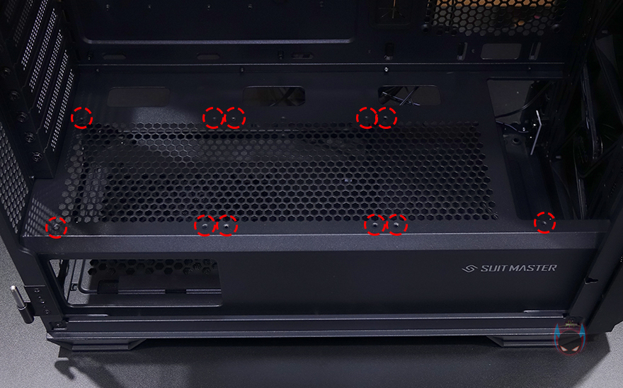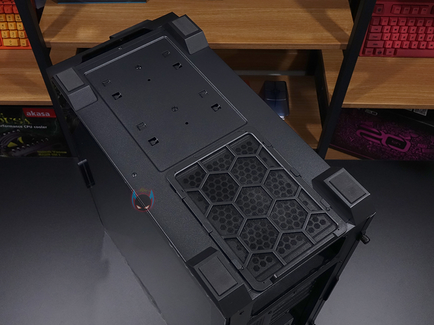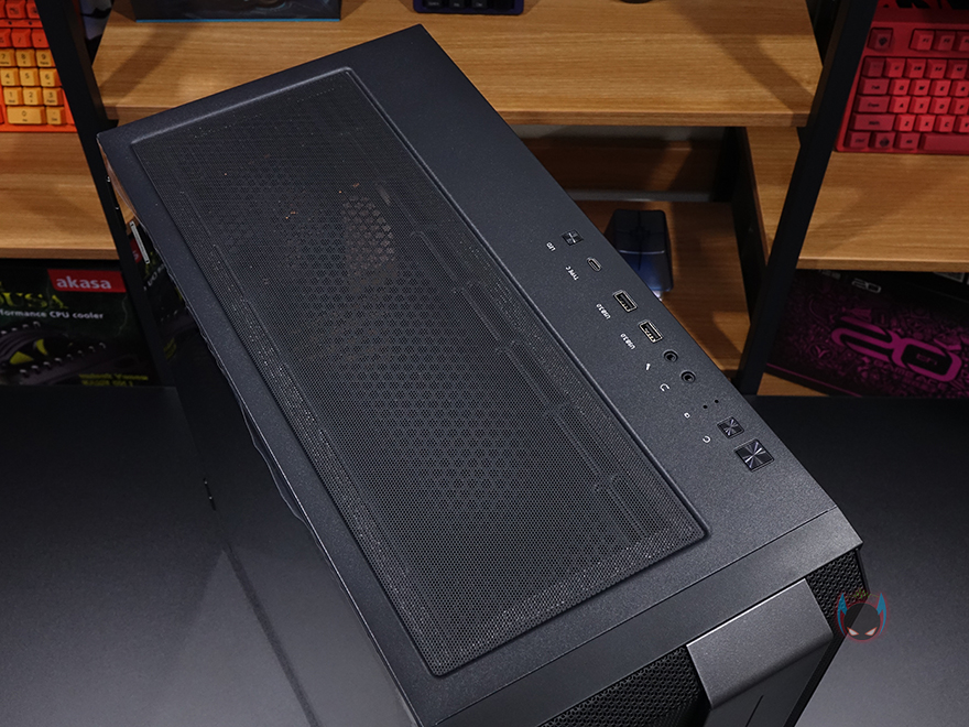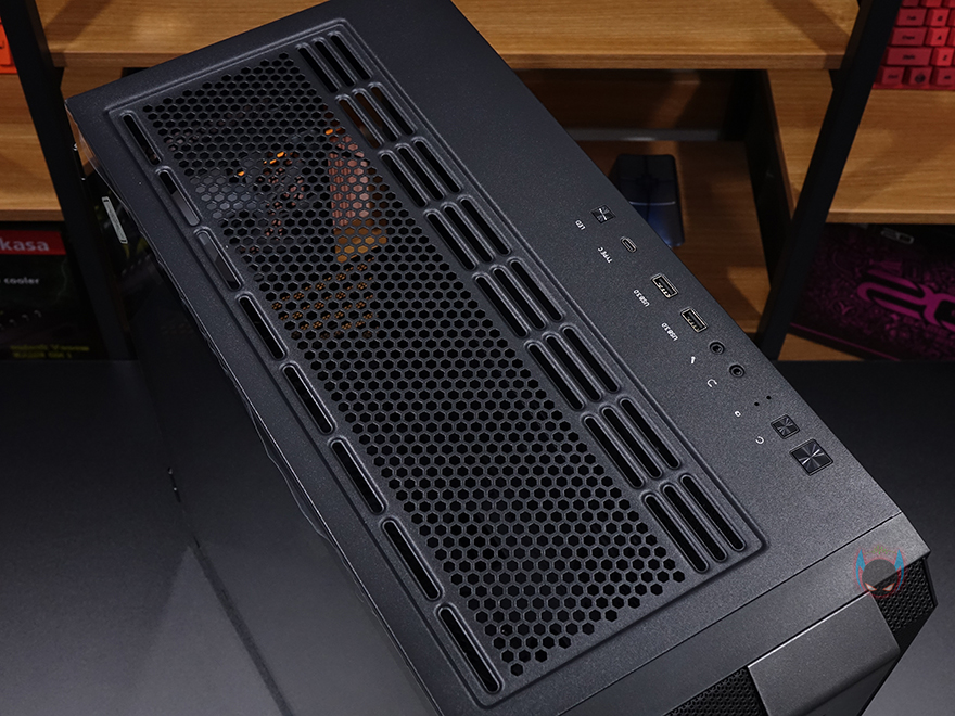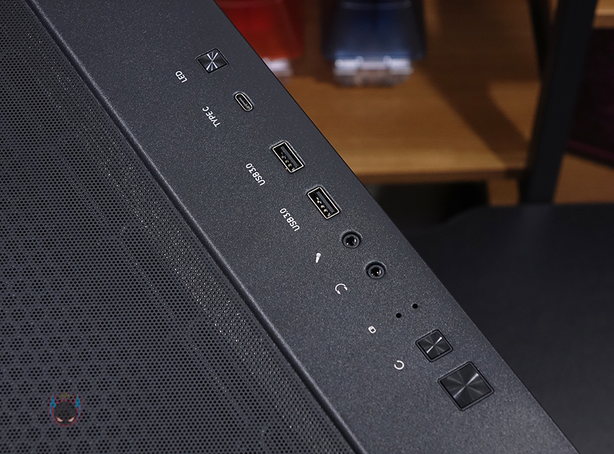 케이스 상단에는 자석방식의 먼지필터가 부착되어 있는데, 분리하면 상단쿨링 효과를 위해 에어홀 처리와 함께 추가로 팬이나 수냉쿨러 사용시 라디에이터를 장착할 수 있게 나사홀 처리도 되어있죠. 참고로 팬은 140mm경우 최대 2개, 120mm 경우 최대 3개, 라디에이터도 최대 360mm까지 장착할 수 있습니다. 그리고, 상단 오른쪽에는 버튼 및 포트가 배치되어 있는데, 맨 앞부분에 전원버튼을 시작으로 뒤로 리셋버튼, 작동상태 LED램프, EAR/MIC 포트, USB 3.0 포트, USB Type-C 포트, LED 모드전환 버튼이 배치되어 있습니다.