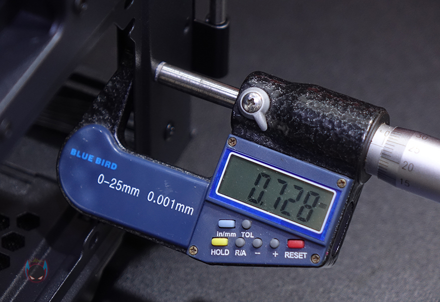 내부 하단 커버가 적용되어 있기때문에 파워서플라이는 오른쪽 측면에서 장착할 수 있는데, 파워서플라이 자리를 보면 받침 역할과 진동소음 최소화를 위해 패드가 부착된 것을 확인할 수 있습니다. 그리고, 같은 위치에서 앞부분에는 3.5인치 HDD베이가 적용되어 있는데, 1개의 가이드가 장착되어 있으며, 슬라이드 방식의 가이드를 쉽게 분리해서 3.5인치 HDD를 장착할 수 있습니다. 물론, 2.5인치 SSD/HDD도 장착이 가능하죠. 또한, HDD베이를 앞서 외부 케이스 밑바닥에서 확인했듯이 고정나사를 풀면 분리가 가능한데, 분리한 상태에서 베이 상단에 추가로 3.5인치 HDD나 2.5인치 SSD/HDD가 장착가능합니다. 그리고, 앞서 언급했듯이 베이 좌우 자리이동도 가능하죠. 끝으로, 슈트마스터 P2000 퍼포먼스 PC케이스에 사용된 샤시의 두께를 측정해봤는데, 약 7mm대를 가진 것을 확인할 수 있습니다.