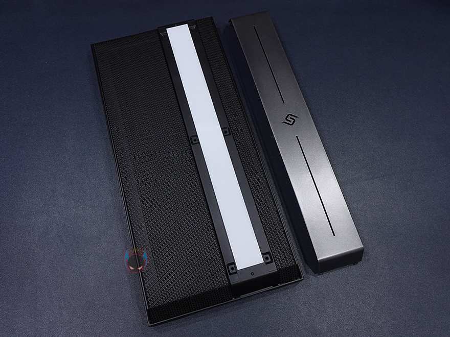 또한, 전면 베젤은 바로 분리가 가능한데, 분리해서 안쪽을 확인해보면, 오른쪽 맨 아래 구석에 RGB효과를 보여주기 위한 LED 바(Bar)와 케이블 없이 접촉되는 접지방식의 PCB기판이 적용된 것을 확인할 수 있습니다. 보통 이런장치는 해외브랜드의 고급형 PC케이스에서 볼 수 있기때문에, 앱코가 이 제품에 꽤나 신경을 많이 썼다라는 것을 느낄 수 있는 부분이라 할 수 있습니다. PCB기판에 보면 LED-바와 연결되는 케이블도 확인할 수 있죠. 실제, 메탈패널까지 분리하면 내부에 LED-바가 들어있는 것을 확인할 수 있습니다. 또한, 전면 베젤을 분리했을 때, 전면 내부에 140mm 팬이 3개 장착된 것도 확인할 수 있죠. 요즘 PC케이스가 대부분 전면에 RGB 팬을 적용하는 경우가 많은데, P2000 퍼포먼스는 LED-바를 적용했기때문에 일반 140mm 팬을 적용한겁니다.