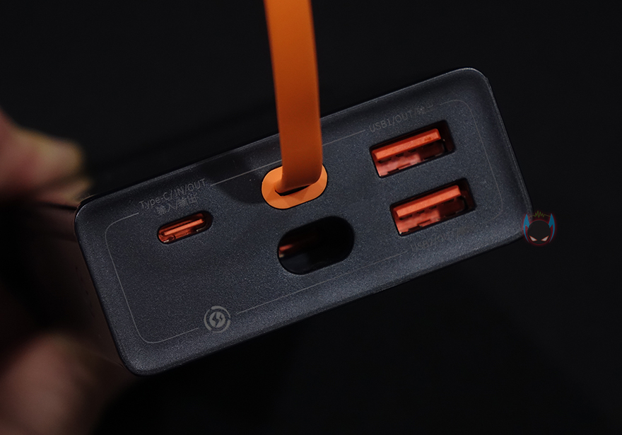 배터리 후면에는 앞서 제품박스에서 확인했던 제품 사양표기를 다시 한 번 확인할 수 있는데, 바로 뒤에서 확인하겠지만, USB Type-C 포트는 모두 입출력 65W를 지원하고, USB Type-A 포트는 출력포트로 최대 30W까지 지원합니다. 실제로 전면에 배치된 포트부분을 살펴보면, 앞서 언급했듯이 기존 제품들과 확실한 차이로 USB Type-C 형태의 충전케이블이 고정 적용된 것을 확인할 수 있는데, 사용하지 않을 때는 마개포트를 제공해주고 있어서 포트정리를 할 수 있으며, 케이블은 TPE 재질로 고무와 플라스틱 성질을 모두 가진 케이블로 적용했습니다. 길이는 약 18cm입니다. 그리고, 충전케이블을 제외하고 추가로 USB Type-C 포트가 하나 더 있고, USB Type-A 포트가 2개 총 3개의 포트를 지원해주고 있죠. 그래서, 바로 위에서 언급했듯이 USB Type-C 포트는 충전케이블까지 포함해서 2개인데, 이 2개가 모두 65W 입출력을 지원한다라는 겁니다.