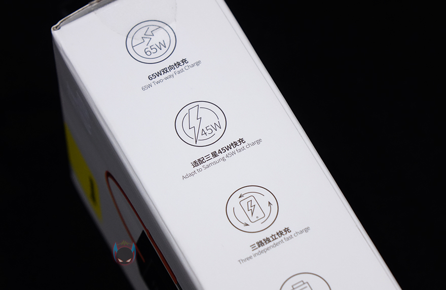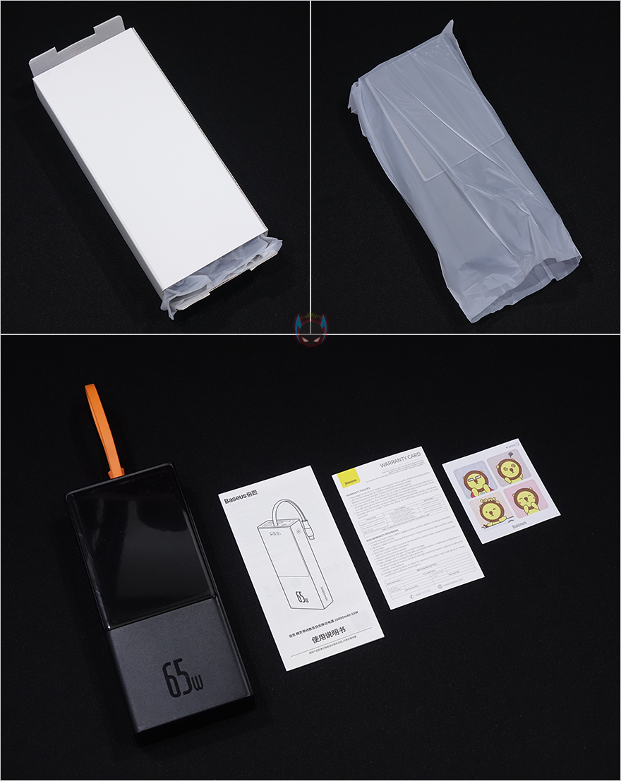 제품 팩키지형태는 기존의 자사 제품들처럼 박스형태로 전면에는 제품 이미지를 담고 있는데, 기존 제품과 다른 점이 한가지 있다라는 것을 쉽게 짐작할 수 있습니다. 바로, 충전케이블이 적용되어 있다라는건데, 이부분은 뒤에서 다시 언급하도록 하고, 모델명에는 배터리용량 표기와 함께 최도 65W 충전지원도 확인할 수 있습니다. 또한, 박스 측면에는 제품의 주요특징으로 입/출력 모두 65W 출력 지원, 삼성 제품 최대 45W 지원, 3개의 고속충전 포트, 배터리용량, 디지털 디스플레이, TPE 케이블을 표기하고 있죠. 물론, 박스후면에 연출이미지와 함께 제품의 기본 사양 표기도 확인할 수 있는데, 각 포트의 입/출력 지원부터 배터리 무게까지 상세하게 표기해놨습니다.