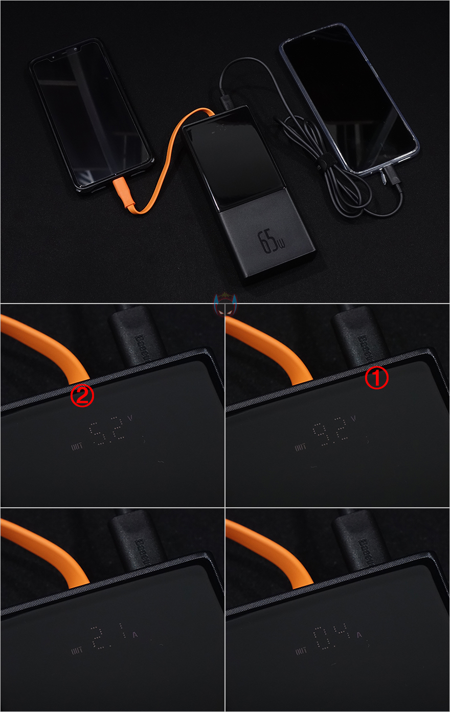 실제로 베이스어스 65W 디지털 디스플레이 보조배터리를 사용해보면, 일단 충전할 제품에 연결해서 전원을 켜주면, 전면 광택부분 그러니깐 디스플레이부분에서 배터리가 입출력 상태인지 보여주면서 배터리 용량도 퍼센트(%)로 보여줍니다. 그리고, 이상태에서 전원버튼을 한 번씩 누르면 전압과 전류 상태로 보여주죠. 먼저 나왔던 블레이즈 보조배터리의 디스플레이방식과 유사합니다. 또한, 충전케이블외에 추가적으로 케이블을 사용해서 2개이상의 기기를 충전할 때도 전원버튼을 누르면, 연결된 각 충전포트의 전압과 전류상태를 보여주는데, 참고로 USB Type-C 경우 충전케이블부분이 2번이고, 포트만 있는 부분이 1번입니다. 그러니깐 포트부분을 먼저 보여주고, 그다음 케이블부분을 먼저 보여준다라는거죠. 그리고, 나머지 USB Type-A는 1번과 2번 표기대로 보여줍니다. 끝으로, 보조배터리 충전 그러니깐 입력속도를 확인해보면, 배터리용량에 따라 충전속도 차이가 있겠지만, 약 63W까지 표기되는 것을 확인할 수 있어서, 최대 65W까지 지원한다라는 것을 예상할 수 있습니다.