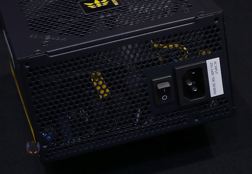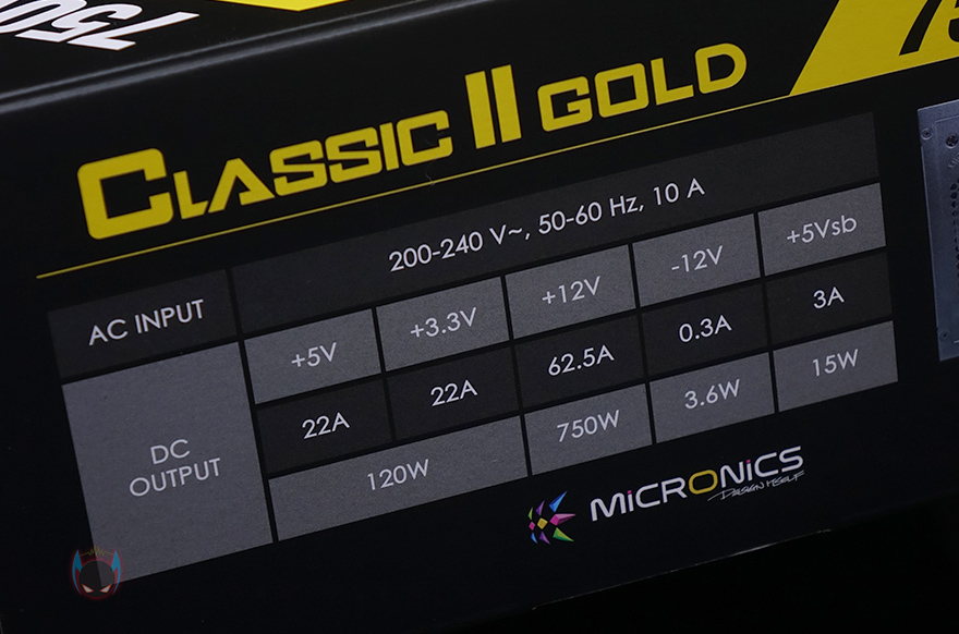 케이블이 기본연결된 방식의 마이크로닉스 클래식2 80Plus 골드 파워서플라이는 살펴보면, 일단 제품박스에서도 잠깐 언급했듯이 올해부터 마이크로닉스 로고가 바뀌었습니다. 그래서, 작년에 출시된 풀-모듈러 제품과 비교해보면 몸체 상단에 로고가 바뀐 것을 확인할 수 있고, 모서리 나사부근에도 로고가 추가로 새겨진 것을 확인할 수 있습니다. 그래도, 사이즈는 ATX 파워서플라이 최소 깊이인 140mm로 동일하죠. 그리고, 상단 벌집모양의 에어홀 처리와 함께 내부에는 120mm 팬이 장착된 것을 확인할 수 있으며, 후면에도 배기역할로 에어홀이 처리되어 있습니다. 전압규격은 국내시장과 유럽시장에 맞춘 200~240V를 지원합니다. 그래서, 80Plus 골드등급 인증도 유럽 230V EU기준에서 인증 받았죠.