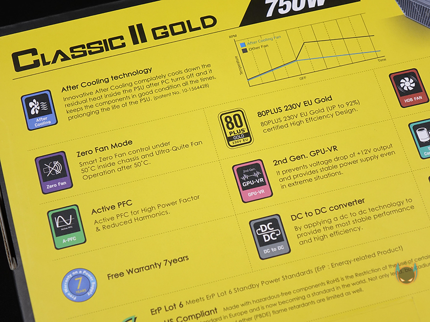 제품박스부터 살펴보면, 작년 풀-모듈러식으로 나왔던 제품과 박스 디자인은 유사합니다. 하지만, 전체적인 배경색이 80Plus 골드색상에 맞춘 노란색에 로고도 올해부터 바뀐 마이크로닉스의 새로운 로고가 적용되어 있죠. 그리고, 제품의 주요특징을 간략하게 표시해놨는데, 80Plus 골드등급, 2세대 GPU-VR, 애프터쿨링, 제로팬 모드는 풀-모듈러 제품에서도 적용되었던 부분으로 동일합니다. 또한, 박스 측면에는 제품의 기본사양과 커넥터 지원개수도 확인할 수 있죠. 참고로, 기본 케이블형식의 클래식2 80Plus 골드는 750W와 650W 2가지 용량으로 출시되었습니다.