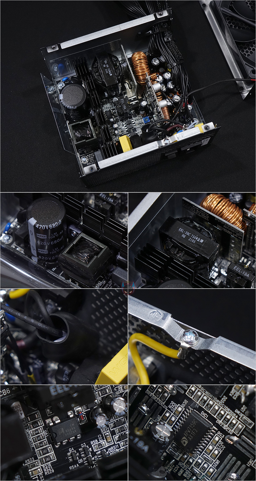 마이크로닉스 클래식2 80Plus 골드 파워서플라이 내부를 잠깐 살펴보면, 내부에 장착된 120mm 팬은 HDB베어링 방식의 팬으로 저소음 팬에 공기흐름 유지를 위해 에어가이드도 적용되어 있습니다. 참고로, 팬 속도는 최대 2400RPM까지 작동합니다. 그리고, 내부를 좀 더 살펴보면, 메인 캐패시터는 긴 수명의 대만 TEAPO 105℃ 420V/680㎌ 제품을 사용했으며, 바로 앞쪽에 고주파음 억제의 Active PFC, 안정적인 전력공급을 위한 스위칭트랜스, EMI 필터, 내부전류방지의 접지, OVP(과전압보호), UVP(저전압보호), OPP(과부하보호), OTP(과열보호), SCP(단락보호) 등의 보호회로 칩셋 및 컨트롤 칩셋을 확인할 수 있습니다. 먼저 나온 풀-모듈러 제품의 메인 캐패시터가 일본산이라는 점과 차이를 빼면, 대부분 내부구성은 비슷함으로 탄탄하다 할 수 있습니다.