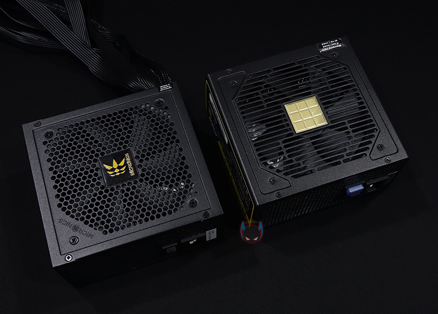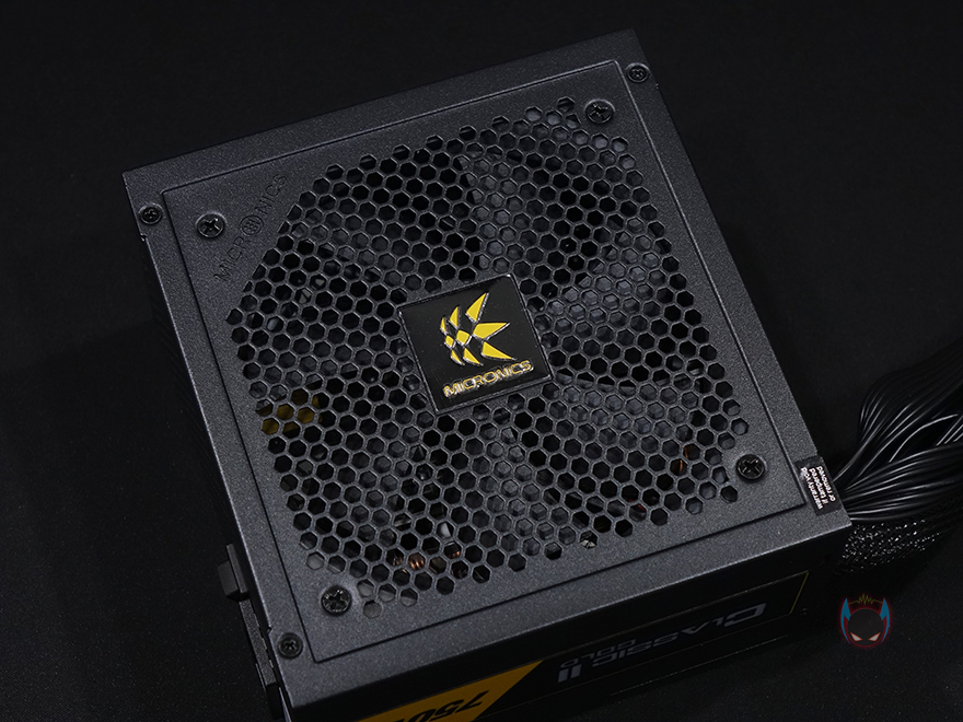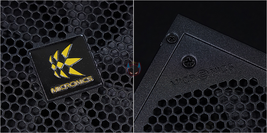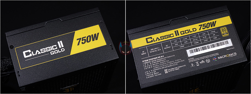케이블이 기본연결된 방식의 마이크로닉스 클래식2 80Plus 골드 파워서플라이는 살펴보면, 일단 제품박스에서도 잠깐 언급했듯이 올해부터 마이크로닉스 로고가 바뀌었습니다. 그래서, 작년에 출시된 풀-모듈러 제품과 비교해보면 몸체 상단에 로고가 바뀐 것을 확인할 수 있고, 모서리 나사부근에도 로고가 추가로 새겨진 것을 확인할 수 있습니다. 그래도, 사이즈는 ATX 파워서플라이 최소 깊이인 140mm로 동일하죠. 그리고, 상단 벌집모양의 에어홀 처리와 함께 내부에는 120mm 팬이 장착된 것을 확인할 수 있으며, 후면에도 배기역할로 에어홀이 처리되어 있습니다. 전압규격은 국내시장과 유럽시장에 맞춘 200~240V를 지원합니다. 그래서, 80Plus 골드등급 인증도 유럽 230V EU기준에서 인증 받았죠.