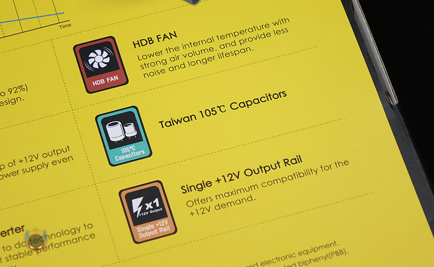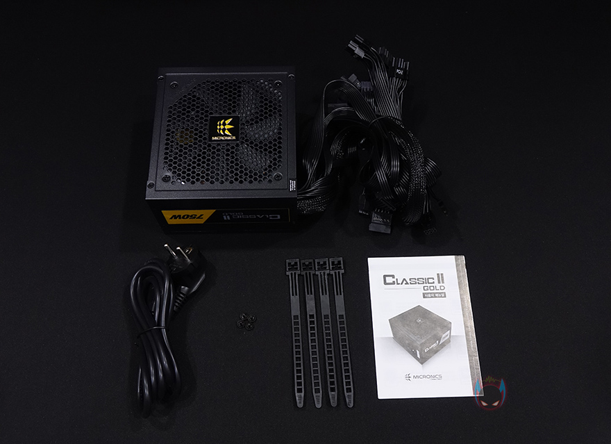 박스 후면에는 좀 더 자세하게 제품 특징을 설명하고 있는데, 애프터쿨링이나 제로팬 모드 지원 같은경우는 마이크로닉스 제품에선 거의 대부분 볼 수 있는 지원으로 특히, 애프터쿨링이 가장 대표적인 특징이죠. 이외 Active PFC, 80Plus 골드등급 인증, 2세대 GPU-VR, DC to DC 컨버터, HDB베어링 팬, 대만산 메인 캐패시터, +12V 싱글레일, 7년 무상보증기간, 친환경 인증 표시도 확인할 수 있습니다. 참고로, 작년에 먼저 출시한 풀-모듈러는 10년 무상보증기간입니다. 제품 포장은 기존 제품들과 큰 차이가 없으며, 제품구성도 파워서플라이, 전원케이블, 장착에 필요한 스크류, 소량의 케이블타이, 제품설명서로 기본구성을 이루고 있죠.