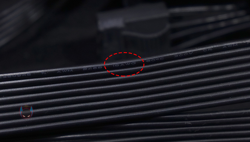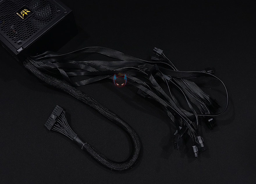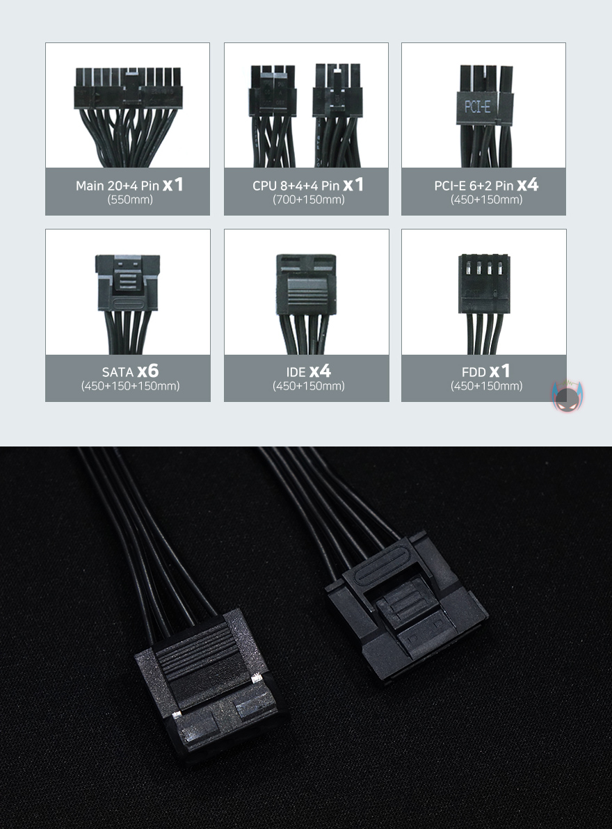몸체 양쪽 측면에는 모델명과 제품박스에서 확인했던 해당 제품의 기본사양 표기를 다시 확인할 수 있으며, 케이블은 이미 언급한대로 기본고정으로 달려있는 일반형태로 메인보드 24핀 전원케이블을 제외한 나머지 케이블들은 모두 플랫(Flat)타입입니다. 전선규격은 인텔 파워서플라이 가이드 기준에 맞춘 18AWG를 사용하고 있죠. 참고로, 풀-모듈러 제품은 16AWG를 사용했습니다. 그리고, 케이블 길이들은 요즘 PC케이스 트랜드에 맞춘거라 넉넉한 길이를 가지고 있으며, 메인보드 24(20+4)핀 커넥터를 비롯해 ATX보조전원 단일 8핀 1개와 4+4방식의 8핀 1개, 그래픽카드 보조전원 PCI-E 8(6+2)핀 4개, S-ATA 6개, P-ATA(IDE) 4개, FDD 1개를 구성하고 있습니다. S-ATA 커넥터 일부와 P-ATA 커넥터는 고정성과 쉬운 분리를 위해 락킹과 이지스왑식으로 처리되어 있죠.