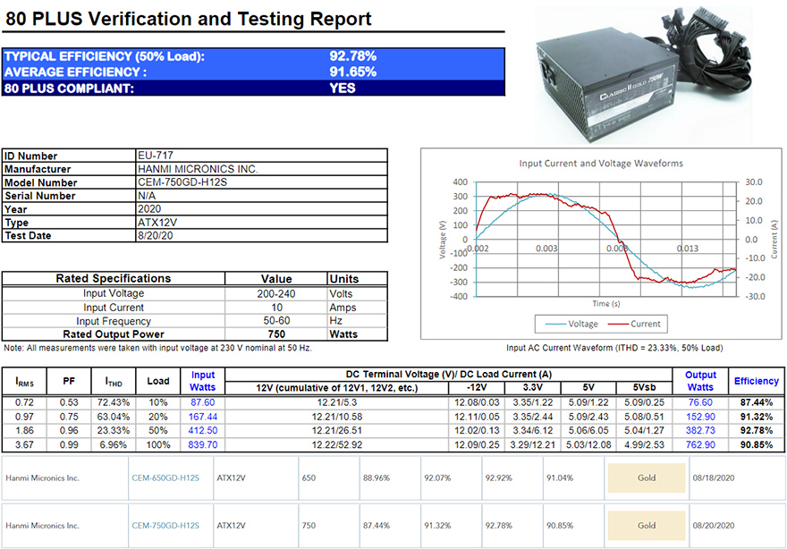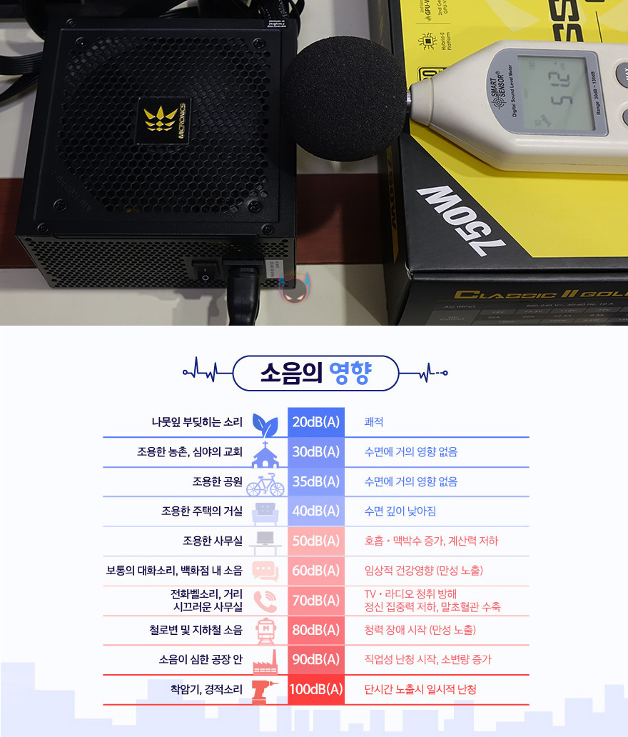 그리고, 케이블이 기본연결된 방식의 마이크로닉스 클래식2 80Plus 골드 파워서플라이의 전력효율은 실제 80Plus 홈페이지에 등록된 정보로 확인해보면 50% Load 상황에서 최대 92.78%, 평균 91.65%의 전력효율을 가지고 있음을 확인할 수 있습니다. 골드등급을 받을 수 있는 효율이죠. 참고로 750W보다는 650W가 조금 더 효율이 높습니다. 끝으로, 마이크로닉스의 가장 대표적인 특징인 PC 사용후 전원을 껐을 때 작동하는 파워서플라이 내부 잔열해결 기능인 애프터쿨링이 작동되었을 때 팬 소음을 측정해봤는데, 약 51dB(A) 수준으로 장착된 팬의 최대속도로 작동되면서 신속하게 해결한다라는 것을 알 수 있습니다. 물론, 이정도 소음이면 PC케이스 내부에 장착하고 사용했을 때, 다른 부품들의 팬 소음에 묻히는 수준이라 소음 걱정은 할 필요가 없죠.