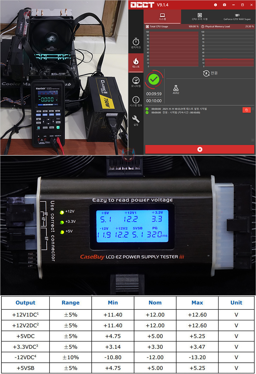 실제로 마이크로닉스 클래식2 80Plus 골드 파워서플라이 제품을 사용해보면, 일단 시스템에 사용하기 전 기본 전압출력상태를 확인해보면, 인텔 파워서플라이 가이드 표준범위에서 안정적으로 출력되는 것을 확인할 수 있으며, 직접 PC시스템에 사용했을 때, Idle과 과부하 Load 상황에서 각각 12V와 5V의 출력상태를 확인했을 때도 Idle에선 12V와 5V는 모두 약 0.01V 수준에서 변동을 보이고, Load에선 12V는 약 0.01V 수준, 5V는 일정한 일명 칼-전압을 보여줍니다. 전체변동폭도 12V는 0.04V수준이고, 5V는 0.01수준으로 매우 안정적임을 확인할 수 있죠.