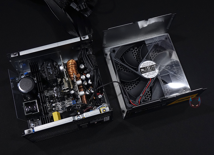 마이크로닉스 클래식2 80Plus 골드 파워서플라이 내부를 잠깐 살펴보면, 내부에 장착된 120mm 팬은 HDB베어링 방식의 팬으로 저소음 팬에 공기흐름 유지를 위해 에어가이드도 적용되어 있습니다. 참고로, 팬 속도는 최대 2400RPM까지 작동합니다. 그리고, 내부를 좀 더 살펴보면, 메인 캐패시터는 긴 수명의 대만 TEAPO 105℃ 420V/680㎌ 제품을 사용했으며, 바로 앞쪽에 고주파음 억제의 Active PFC, 안정적인 전력공급을 위한 스위칭트랜스, EMI 필터, 내부전류방지의 접지, OVP(과전압보호), UVP(저전압보호), OPP(과부하보호), OTP(과열보호), SCP(단락보호) 등의 보호회로 칩셋 및 컨트롤 칩셋을 확인할 수 있습니다. 먼저 나온 풀-모듈러 제품의 메인 캐패시터가 일본산이라는 점과 차이를 빼면, 대부분 내부구성은 비슷함으로 탄탄하다 할 수 있습니다.