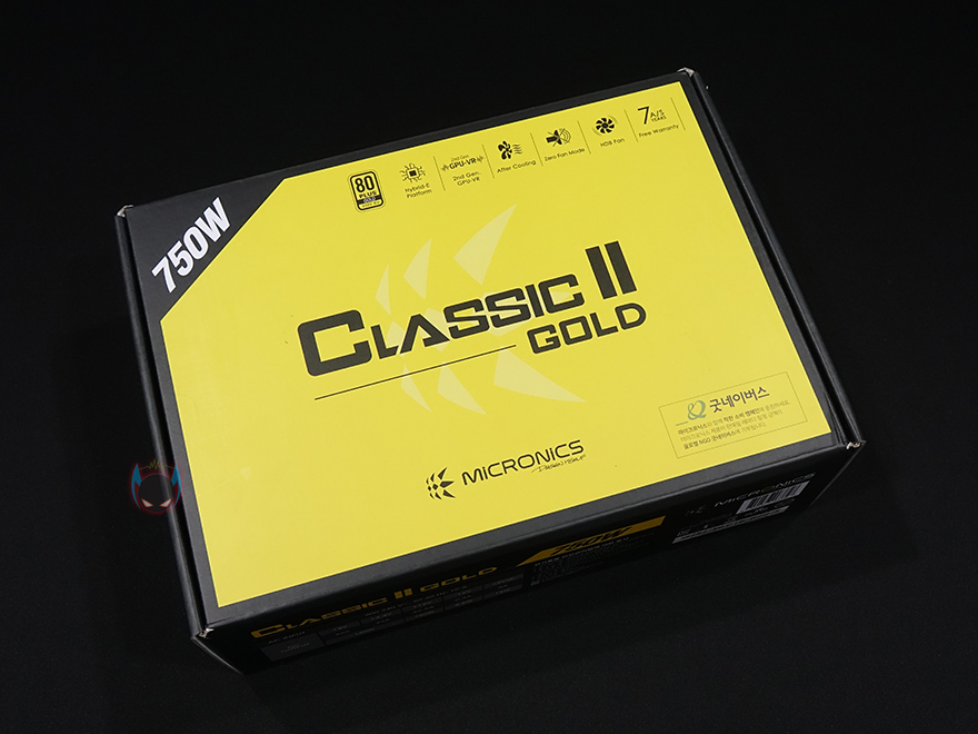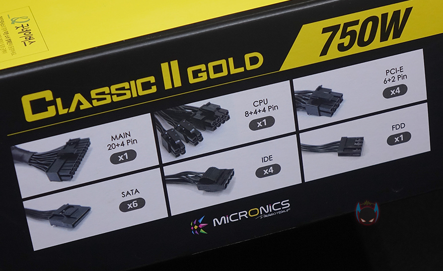제품박스부터 살펴보면, 작년 풀-모듈러식으로 나왔던 제품과 박스 디자인은 유사합니다. 하지만, 전체적인 배경색이 80Plus 골드색상에 맞춘 노란색에 로고도 올해부터 바뀐 마이크로닉스의 새로운 로고가 적용되어 있죠. 그리고, 제품의 주요특징을 간략하게 표시해놨는데, 80Plus 골드등급, 2세대 GPU-VR, 애프터쿨링, 제로팬 모드는 풀-모듈러 제품에서도 적용되었던 부분으로 동일합니다. 또한, 박스 측면에는 제품의 기본사양과 커넥터 지원개수도 확인할 수 있죠. 참고로, 기본 케이블형식의 클래식2 80Plus 골드는 750W와 650W 2가지 용량으로 출시되었습니다.