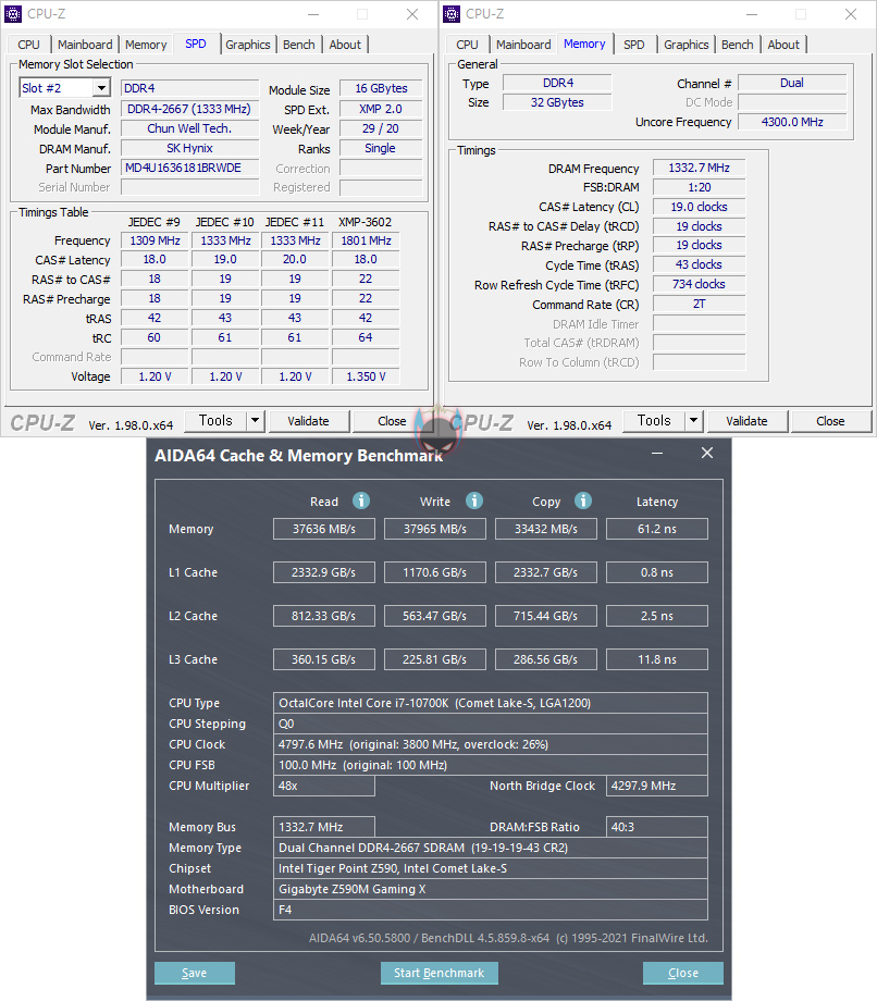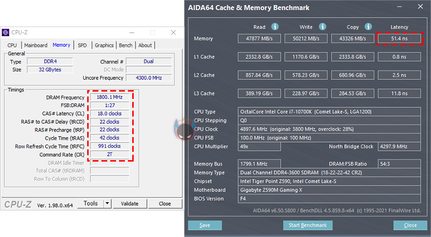 이번엔 OLOy Blade RGB DDR4 메모리의 성능을 확인해보는데, 일단 CPU-Z 프로프램을 통해 메모리 모듈을 확인했을 때 SK하이닉스 메모리모듈이 사용된 것을 확인할 수 있습니다. 그리고, 리뷰에 사용된 모델의 제품 사용에 표기된 클럭은 3600MHz으로 물론, 이 클럭 작동을 위해서는 X.M.P 프로파일을 불러와야 합니다. 그전에 기본 작동시 클럭은 2666MHz으로 작동하죠. 메인보드에서 간혹 일부 메모리 제품들이 XMP 프로파일은 2개씩 저장하는 경우도 있지만, OLOy Blade RGB DDR4 메모리는 1개의 프로파일만 적용되어 있으며, 메인보드를 통해 3600MHz으로 적용했을 시, 메모리 속도가 빨라지는 것을 확인할 수 있습니다.