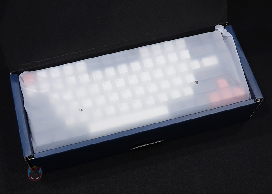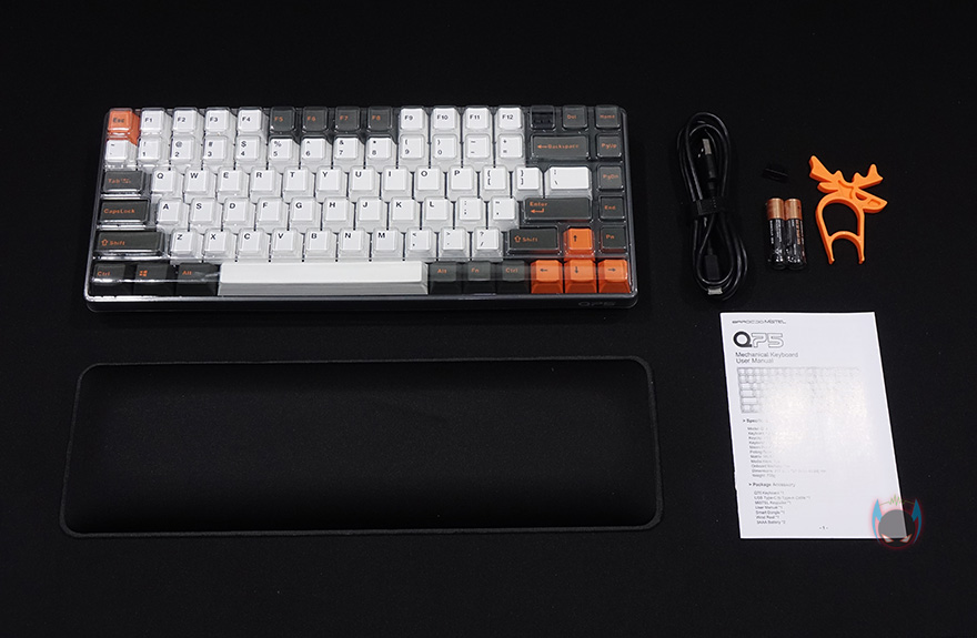제품 팩키지는 박스형태로 심플하게 블루와 옐로우 컬러에 모델명만 전면에 표기하고 있죠. 물론, 박스 측면에 키보드 색상과 언어 레이아웃, 스위치 구분 표시를 해놨고, 반대쪽 측면에는 제품의 주요 특징을 표기해놨는데, 스위치, 운영체제 지원, 유무선 연결방식, USB Type-C 방식의 유선, 매크로기능, PBT 이중사출 키-캡 입니다. 그리고, 박스 후면에는 간단하게 키보드 사이즈를 표기해놨죠. 박스를 열어보면, 다른 키보드 제품들처럼 키보드는 비닐포장이 되어있고, 비닐까지 개봉해서 보면 루프 덮개까지 제공되는 것을 확인할 수 있습니다. Q75 키보드를 비롯해 제품 구성은 팜-레스트, USB Type-C 케이블, AAA 배터리, 키-풀러, 제품설명서로 이루고 있죠.