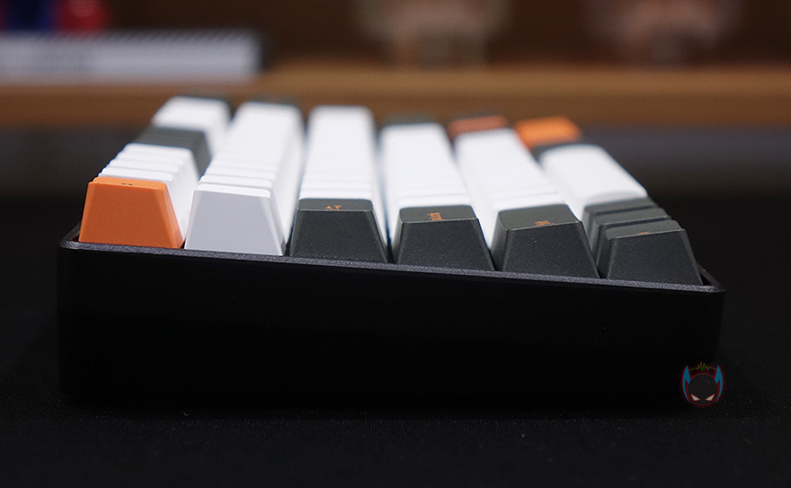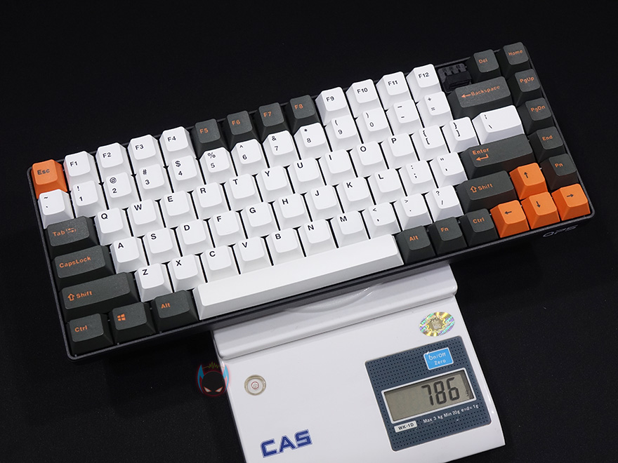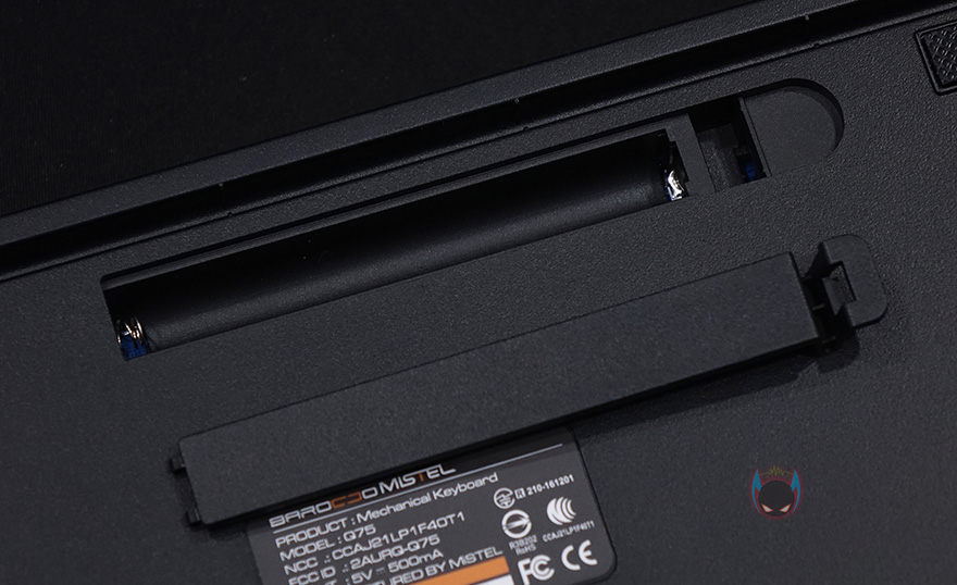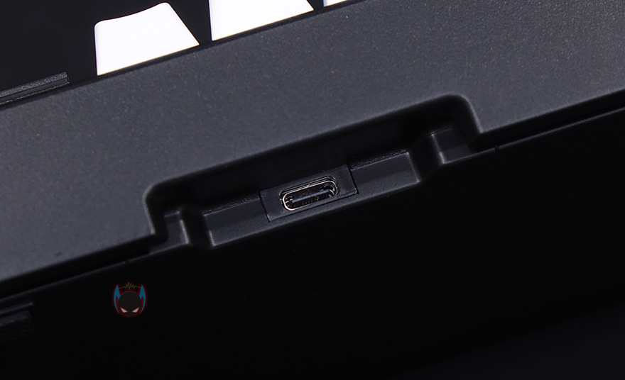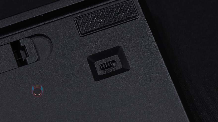 이번엔 하우징 그러니깐 케이스부분을 살펴보면, 오른쪽 하단부에는 모델명을 새겨놨으며, 전면에서 봤을 때 왼쪽부분에 유선 사용시 연결되는 USB Type-C 포트가 배치된 것을 확인할 수 있습니다. 그리고, 키보드측면에서 보면 타이핑의 최적화라 불리우는 스텝-스컬처2 단계배열을 갖춘 것을 확인할 수 있죠. 참고로, 배열 맨 아랫부분의 높이는 23.4mm입니다. 그리고, 키보드 밑바닥부분에는 모서리 부근에 미끄럼방지 패드를 부착해놨으며, 무선 사용시 배터리가 사용되기 때문에 한쪽에 AAA 건전지 2개가 사용되는 수납공간이 있으며, 바로 아래에 무선 On/Off 스위치도 적용되어 있죠. 배터리까지 장착했을 때 키보드의 무게는 약 786g 입니다.