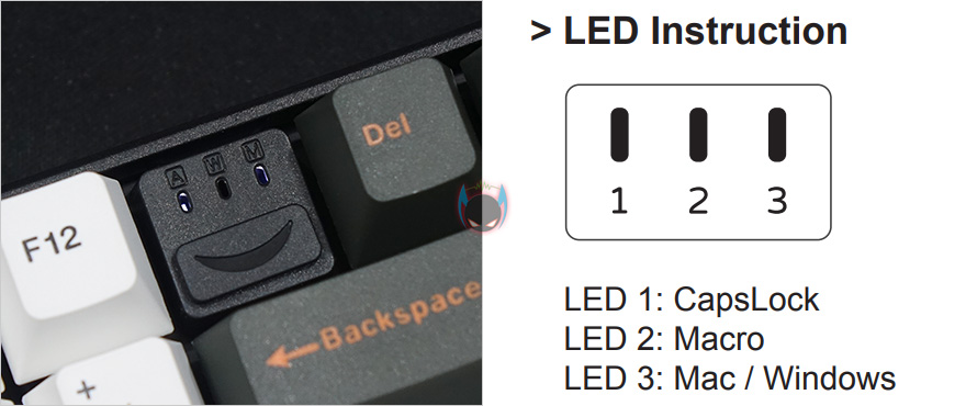 미스텔(MiSTEL) Q75 키보드를 직접 사용해보면, 유선 사용은 제공되는 USB Type-C 케이블을 이용하면 바로 인식되어 사용할 수 있고, 2.4GHz 무선방식 역시 수신기를 PC나 모바일기기에 연결하고, 키보드 밑바닥부분에 On/Off 스위치를 켜면 별도의 페어링 작업없이 바로 연결되어 사용할 수 있습니다. F12키 오른쪽 수신기 수납공간 바로 위에 배치된 LED 인디케이터는 3개로 A(1번)는 CapsLock, W(2번)은 매크로, M(3번)은 Mac/윈도우 모드전환상태로 구분할 수 있죠.