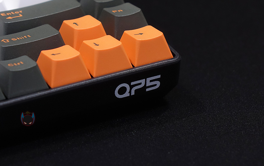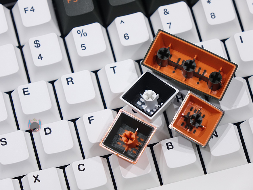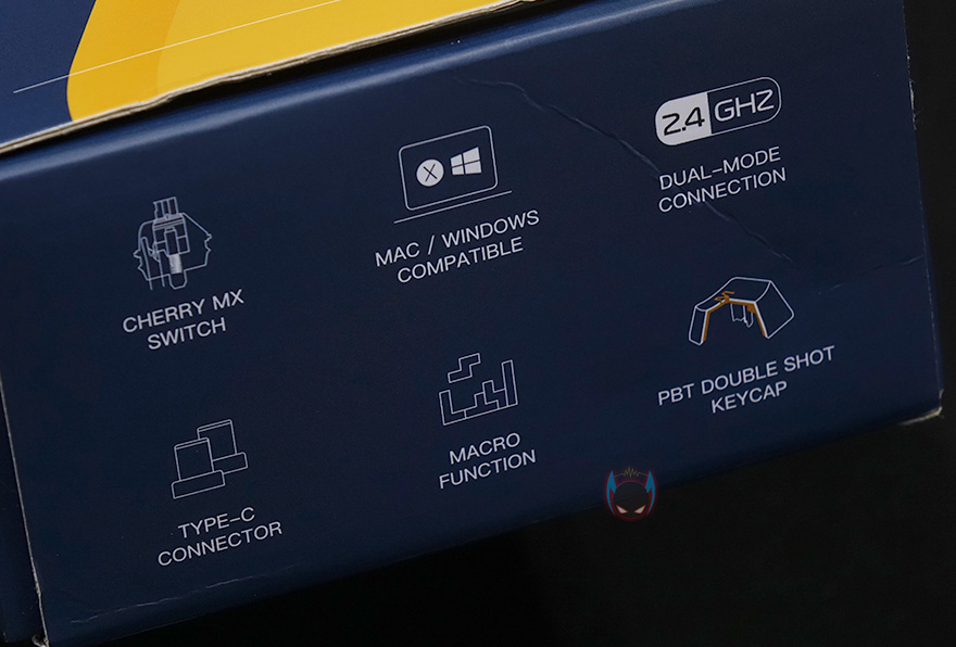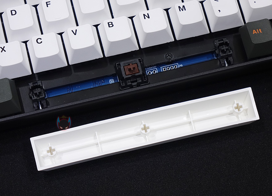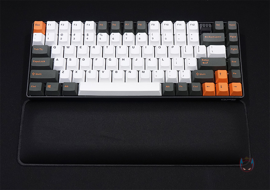 자판 부분을 좀 더 살펴보면, F12키 바로 오른쪽에는 무선 사용시 필요한 일명 동글이라 부르는 2.4GHz USB수신가 꽂혀있는데, 빼내서 PC에 연결해서 사용할 때 빼낸 자리에는 부속품으로 제공해주는 커버를 사용해서 먼지 유입을 방지할 수 있습니다. 그리고, 미스텔 키보드 제품들은 모든 키-캡을 PBT재질로 사용해왔기때문에, 이번 Q75 모델 역시 키-캡은 100% 이중사출 방식의 PBT 키-캡이며, 스위치는 체리 MX 스위치가 사용되었습니다. 앞서 제품박스에서 확인했듯이 체리 MX 스위치 종류는 총 7가지로 적용해서 사용자가 구입시 선택할 수 있고, 스페이스-바 같은 긴 키들의 스테빌라이저도 체리식이죠.