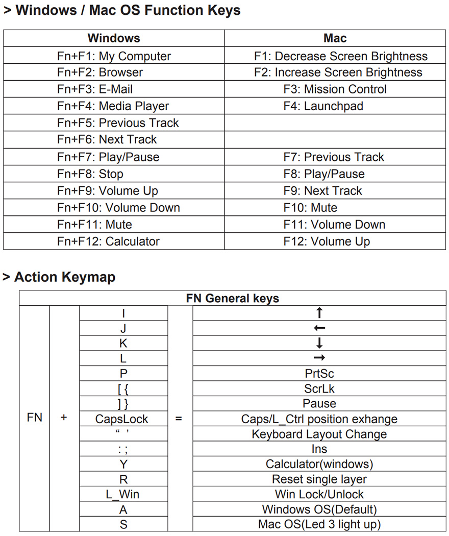 Fn키는 다른 키보드 제품들처럼 부가기능을 지원할 때 사용되는 조합키로, 키-캡에 따로 부가기능 표시가 되어있지 않기때문에, 설명서를 참고해서 기능을 알아두어야 하며, 다른 키보드 제품들에서 지원하는 부가기능들과 큰 차이는 없습니다. 물론, 윈도우용과 Mac용 모두 지원하는 키보드이기때문에 운영체제 사용에 따라 부가기능도 바뀝니다. 그리고, 사이즈가 줄어든만큼 풀-배열 키보드에서 기본 갖추고 있던 일부 키 기능도 Fn키 조합으로 사용되니, 설명서를 참고하시기 바랍니다.