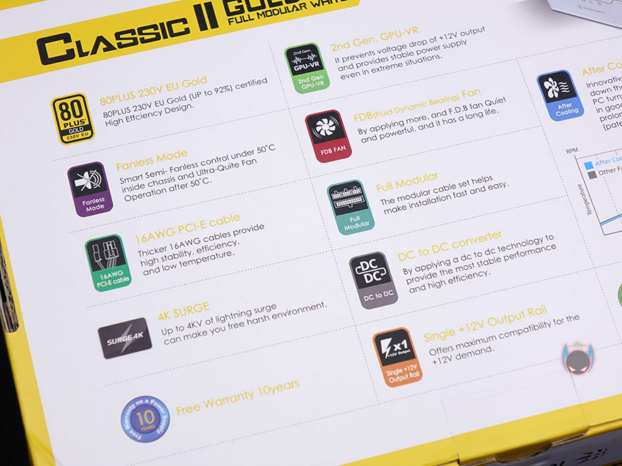 제품팩키지 그러니깐 제품박스부터 살펴보면, 화이트컨셉이기때문에 작년에 먼저 출시되었던 기본 블랙색상의 모델과는 바로 박스에서부터 차별을 주고 있습니다. 박스색상도 화이트라는거죠. 그리고, 1년 사이에 가장 크게 바뀐 것이 있으니 바로, 제조사의 로고가 바뀌었다라는겁니다. 그래서, 이번 클래식2 80PLUS GOLD 230V EU 풀모듈러 화이트 제품박스에는 새로바뀐 로고가 새겨져 있죠. 물론, 이부분을 제외하면 제품의 주요 특징이라든지 케이블 및 커넥터 지원, 제품 사양 등 모두 동일합니다. 특히, 측면에 표기된 케이블 및 커넥터 지원표시를 보면 케이블과 커넥터까지 화이트 색상으로 적용했다라는 것을 미리 알 수 있죠.