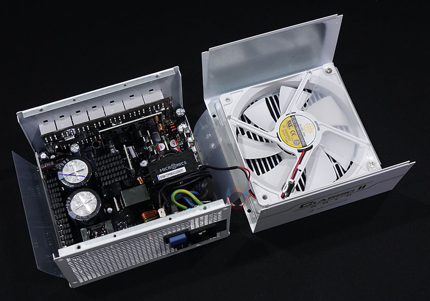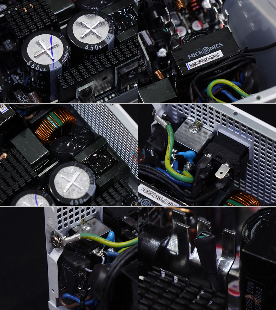 마이크로닉스 클래식2 80PLUS GOLD 230V EU 풀모듈러 화이트 파워서플라이 내부를 잠깐 살펴보면, 내부에 장착된 120mm 팬 역시 먼저 나왔던 블랙색상의 제품과 동일한 팬으로 색상만 화이트 색상으로 변경되었고, 내부의 메인 캐패시터 역시 일본산 450V/560㎌용량 캐패시터를 2개 적용하고 있으며, 고효율 출력을 위한 트랜스포머, 고조파 발생 억제의 Active PFC, 전자파 노이즈 제거의 EMI 필터, 무부하시 0mW 입력전압을 위한 매직 스위치 IC와 내부 전류흐름방지의 접지, 내부 온도에 따라 팬 속도조절을 할 수 있게 센서가 적용된 것을 확인할 수 있는데, 모두 기존 블랙색상 제품과 동일한 부분입니다. 즉, 화이트 제품에서도 내부구성이 탄탄하다라는거죠.