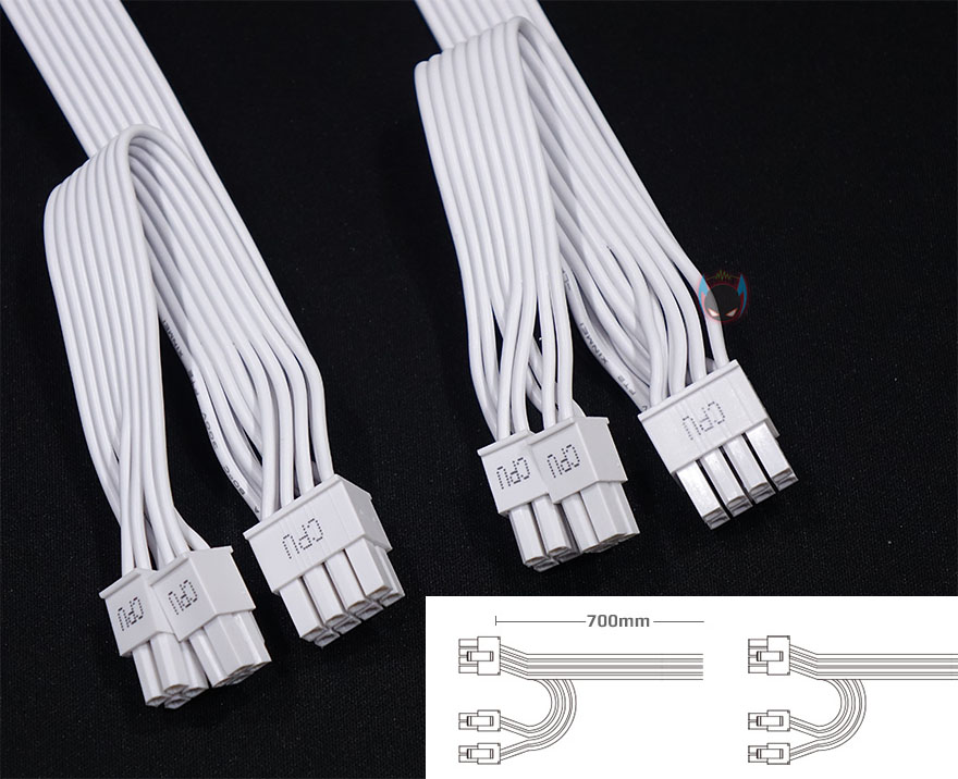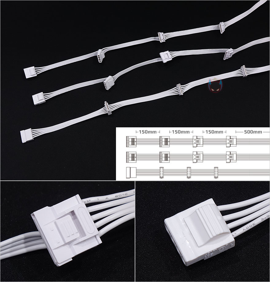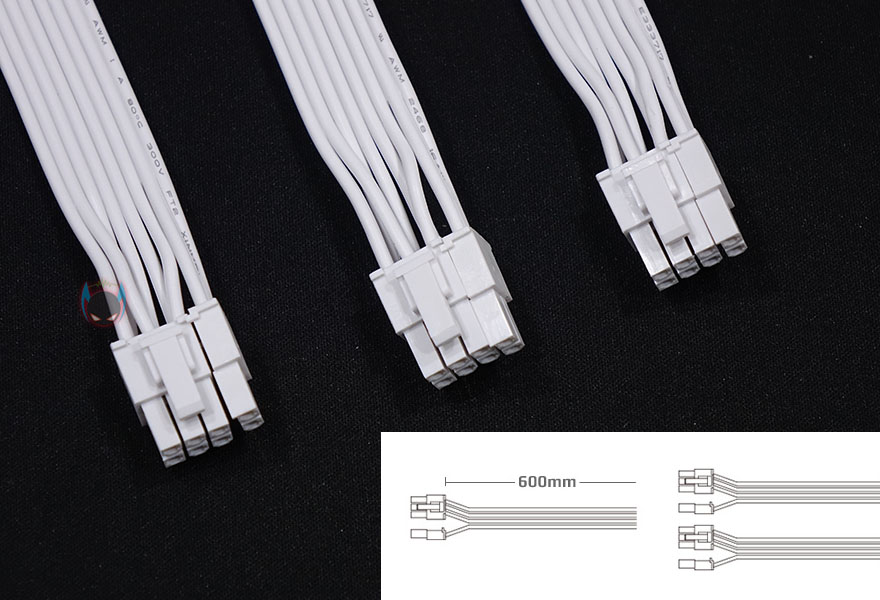 모듈러 케이블은 분리형 FDD 케이블을 포함해 총 10개 구성으로 역시 기존과 동일하며, 그래픽카드 케이블인 PCI-E 케이블은 인텔 파워서플라이 가이드 표준 18AWG 규격보다 한 단계 더 높은 16AWG를 사용했습니다. 참고로 나머지 케이블은 18AWG 규격입니다. 그리고, 모듈러 케이블과 커넥터 모두 역시 화이트 컨셉에 맞춰 화이트색상으로 적용했죠. 케이블 길이도 기존 블랙색상 제품과 동일하며, 요즘 트랜드에 맞춰서 나왔기 때문에 넉넉한 길이를 가졌고, S-ATA 커넥터 일부는 연결이 잘 빠지지 않도록 락킹 S-ATA를, P-ATA는 분리시 쉽게 빠질 수 있게 이지스왑 방식으로 적용해놨습니다.