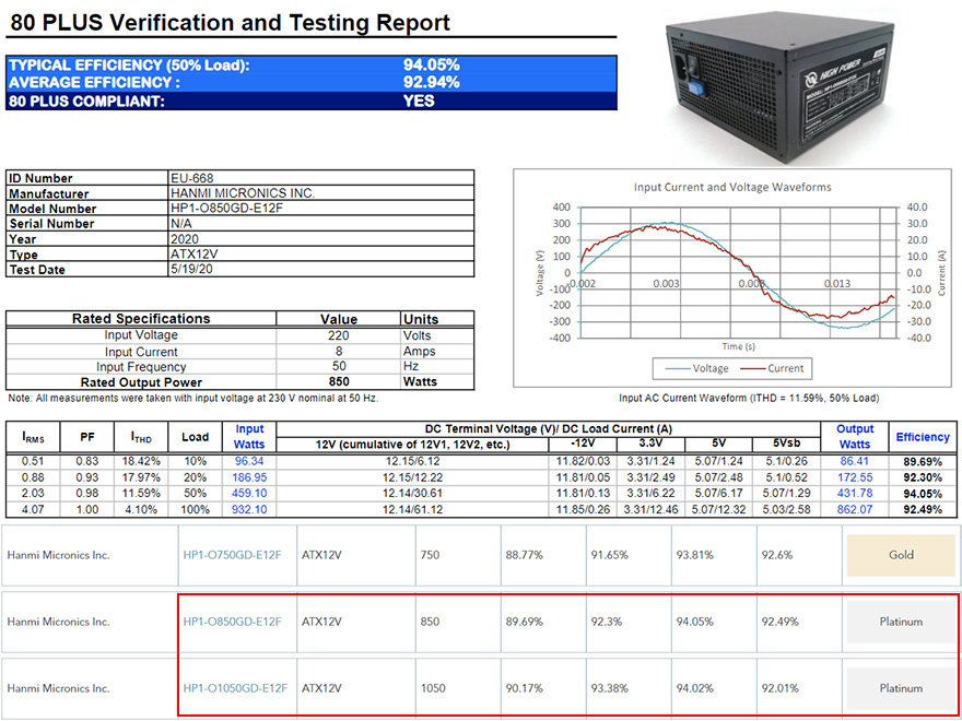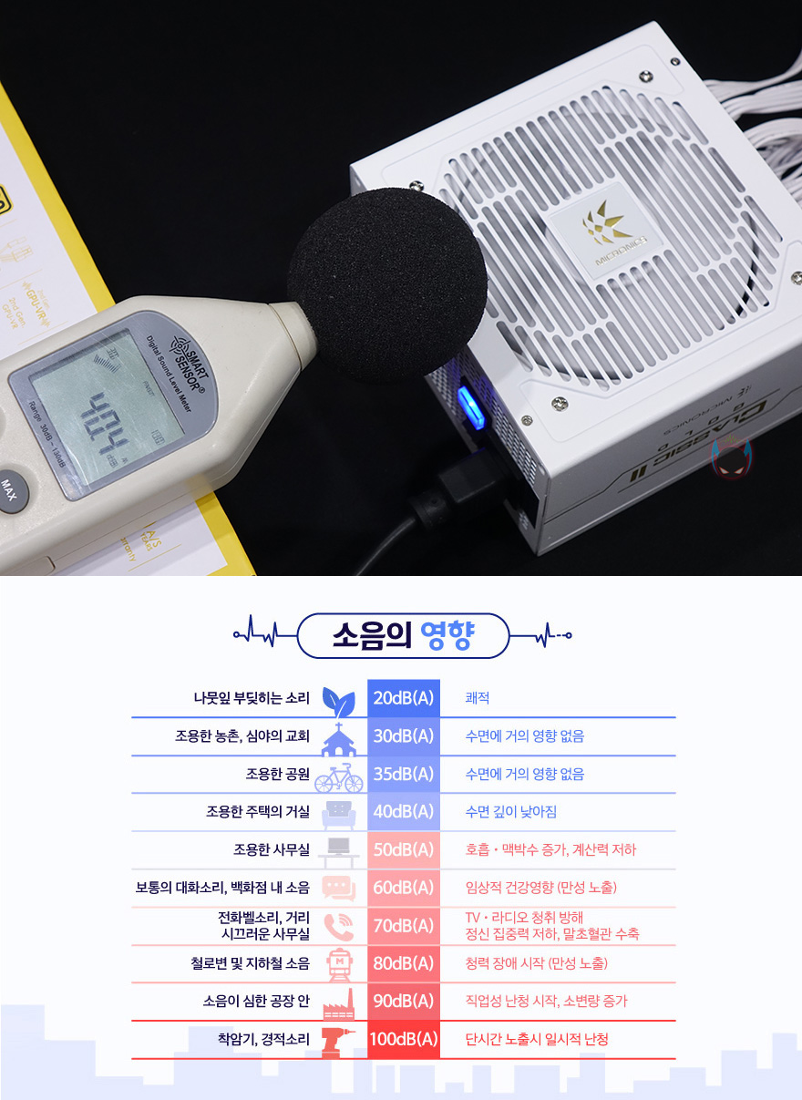 클래식2 80PLUS GOLD 230V EU 풀모듈러 화이트 파워서플라이는 앞서 언급했듯이 기존의 블랙색상 제품에서 색상만 변경되었기 때문에, 80Plus 골드등급 인증은 기존 블랙색상 제품과 동일합니다. 80Plus 인증사이트에 등록된 제품의 전력효율을 확인해보면, 평균 약 92%의 효율과 50% Load 상황에서 94%의 효율록 가장 좋은 모습을 보여준다라는 것을 확인할 수 있죠. 또한, 이미 블랙색상 제품에서도 언급했듯이, 블랙제품에서 가장 낮은 용량이었던 750W 모델이 골드등급을 받았기때문에, 나머지 850W와 1050W도 동일 인증으로 표기되었지만, 실제 850W와 1050W은 플래티넘 등급인거죠. 그래서, 이번 화이트 모델에선 750W를 제외한 나머지 850W와 1050W 두 용량만 출시되었기 때문에, 플래티넘 등급 파워서플라이라고 보면 되겠습니다. 끝으로, 팬리스 모드가 아닌 기본 팬 작동모드로 팬 소음을 측정해보면, 약 40dB(A)로 정숙한 편임을 블랙색상 제품에 이어 화이트색상 제품에서도 그대로 보여주는 것을 확인할 수 있습니다.