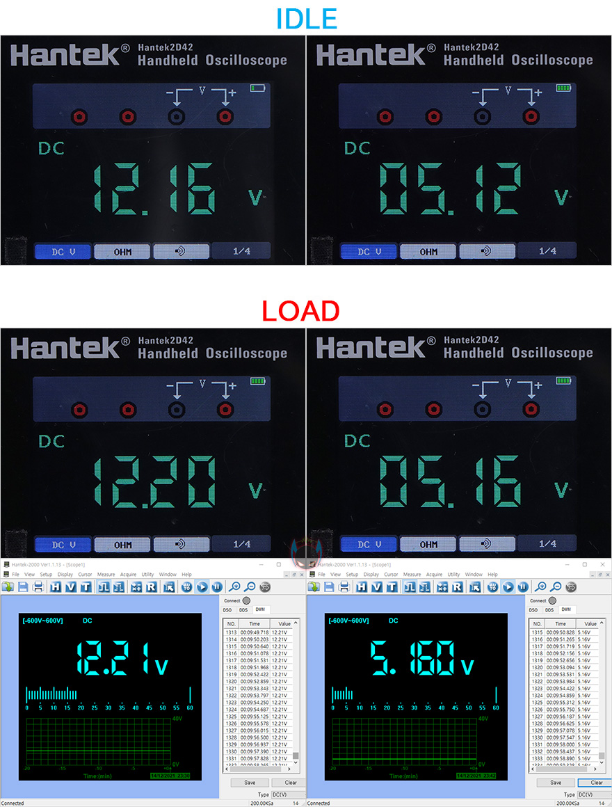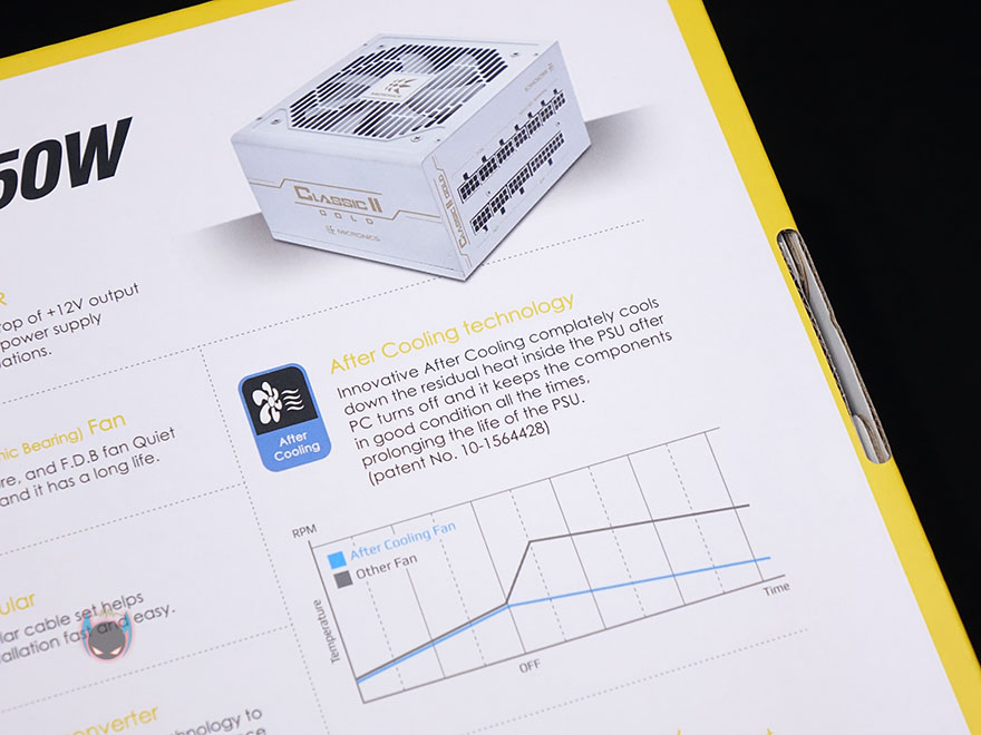 OCCT 프로그램을 통해 Idle과 Load 각 상황에서 12V와 5V 전압 움직임을 측정해본 결과, Idle에선 둘 다 0.01V 범위에서 매우 작게 움직이는 것을 확인할 수 있고, Load에서도 12V는 0.01V 범위에서, 5V는 변동없이 일명 칼전압으로 출력되는 것을 확인할 수 있었습니다. 또한, 전체 변동폭도 12V와 5V 모두 0.04~0.05V 범위에서 매우 작은 편으로 안정적인 모습을 보여줬습니다. 기존의 블랙색상 제품에서도 보여줬던 안정적인 전압출력을 그대로 유지하고 있다할 수 있죠. 그리고, 마이크로닉스 파워서플라이 제품들은 PC 사용 후, 전원을 껐을 때 파워서플라이 잔열배출을 위한 쿨링기능으로 애프터쿨링 기능을 갖추고 있는데, 화이트 제품에서도 그 기능을 확인할 수 있습니다.