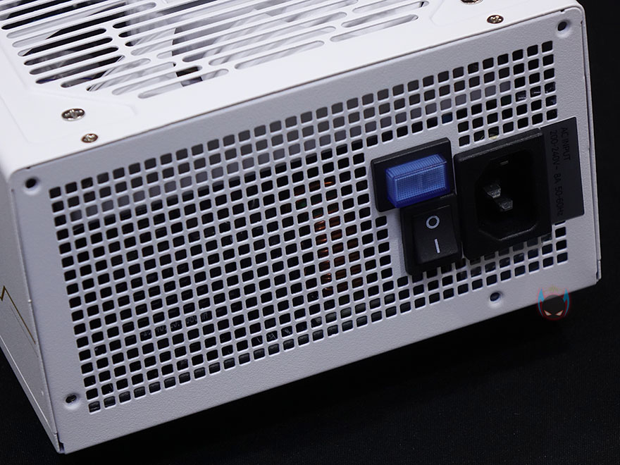또한, 에어홀 처리와 함께 내부에 쿨링 역할로 장착된 120mm 팬 역시 화이트 컨셉에 맞춰서 화이트 팬을 적용하고 있으며, 후면에는 배기역할의 에어홀 처리와 함께 팬리스 모드를 On/Off 할 수 있는 스위치도 기존과 동일하게 적용하고 있습니다. 전면에는 모듈러 케이블과 연결되는 커넥터자리가 배치되어 있는데, 역시 작년에 먼저 출시한 블랙색상 모델과 동일하며, 커넥터 색상도 화이트색상으로 적용하고 있죠. 그리고, 측면에는 모델명, 밑바닥부분에는 제품의 기본 사양을 다시 확인할 수 있습니다.
